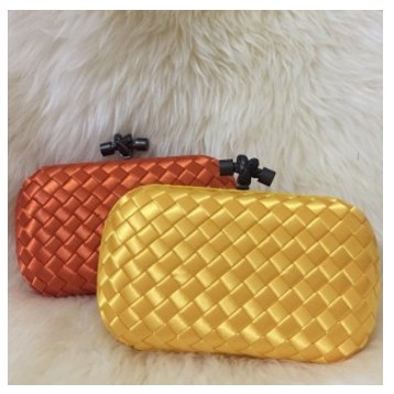 A bolsa Bottega Veneta é toda confeccionada em cetim, com a sua armação em metal revestido de couro.