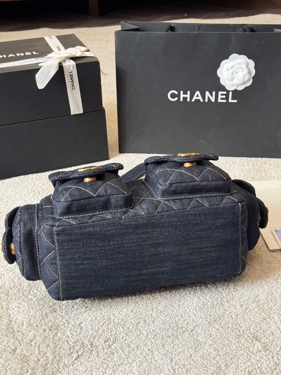 Detalhes de costura e design fiéis ao modelo Chanel 25C.