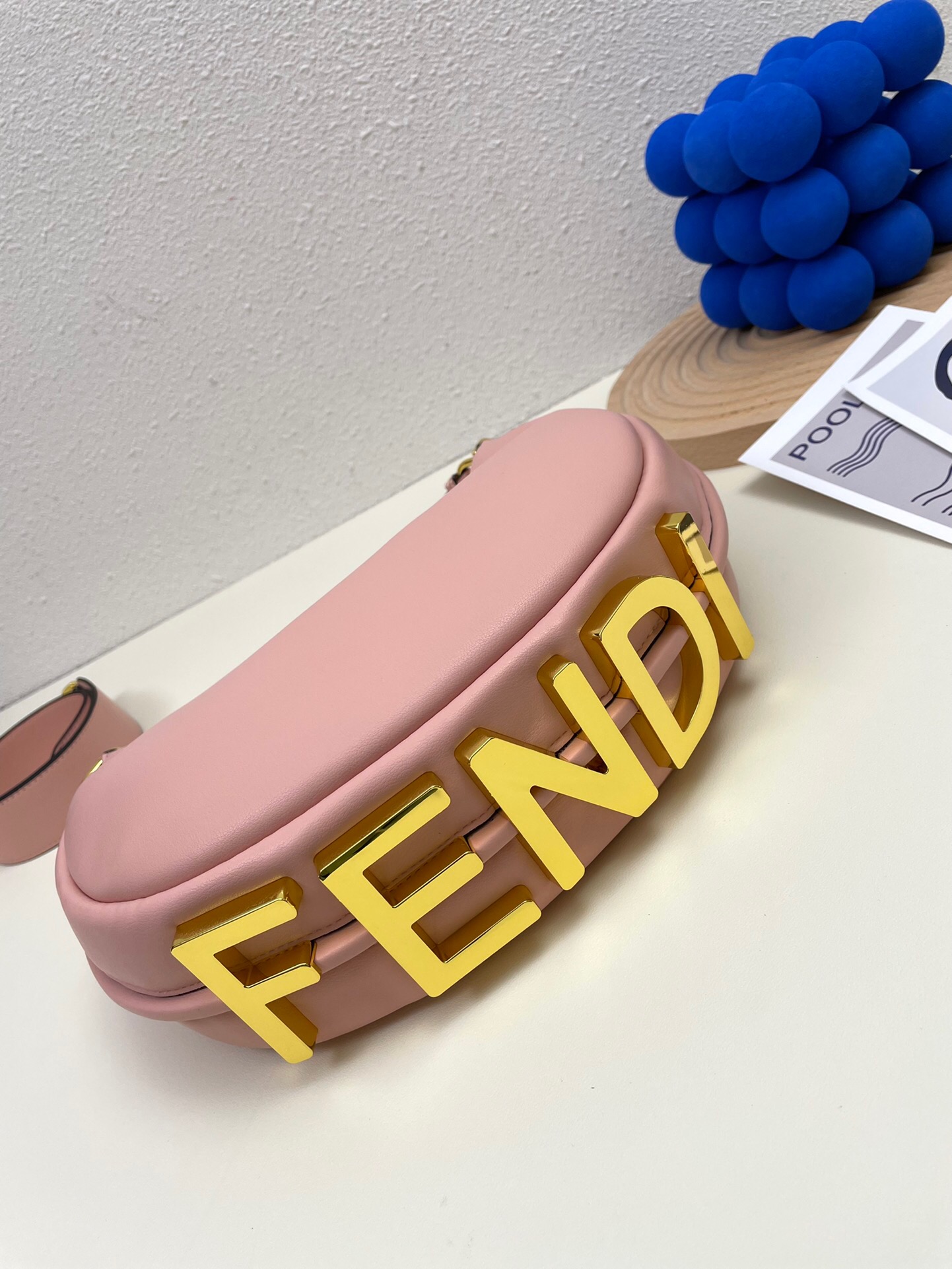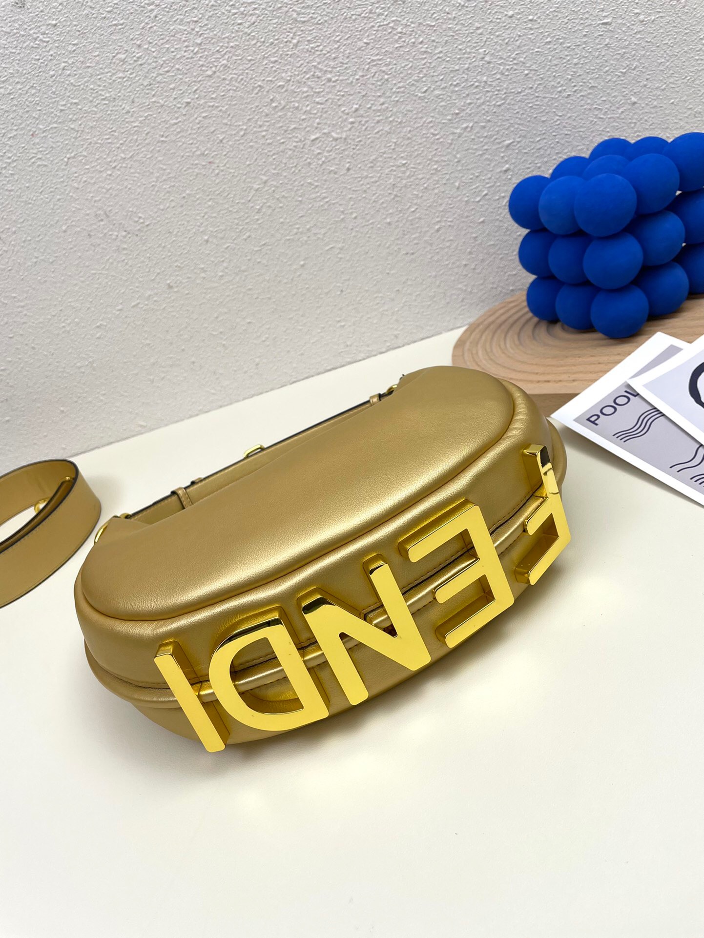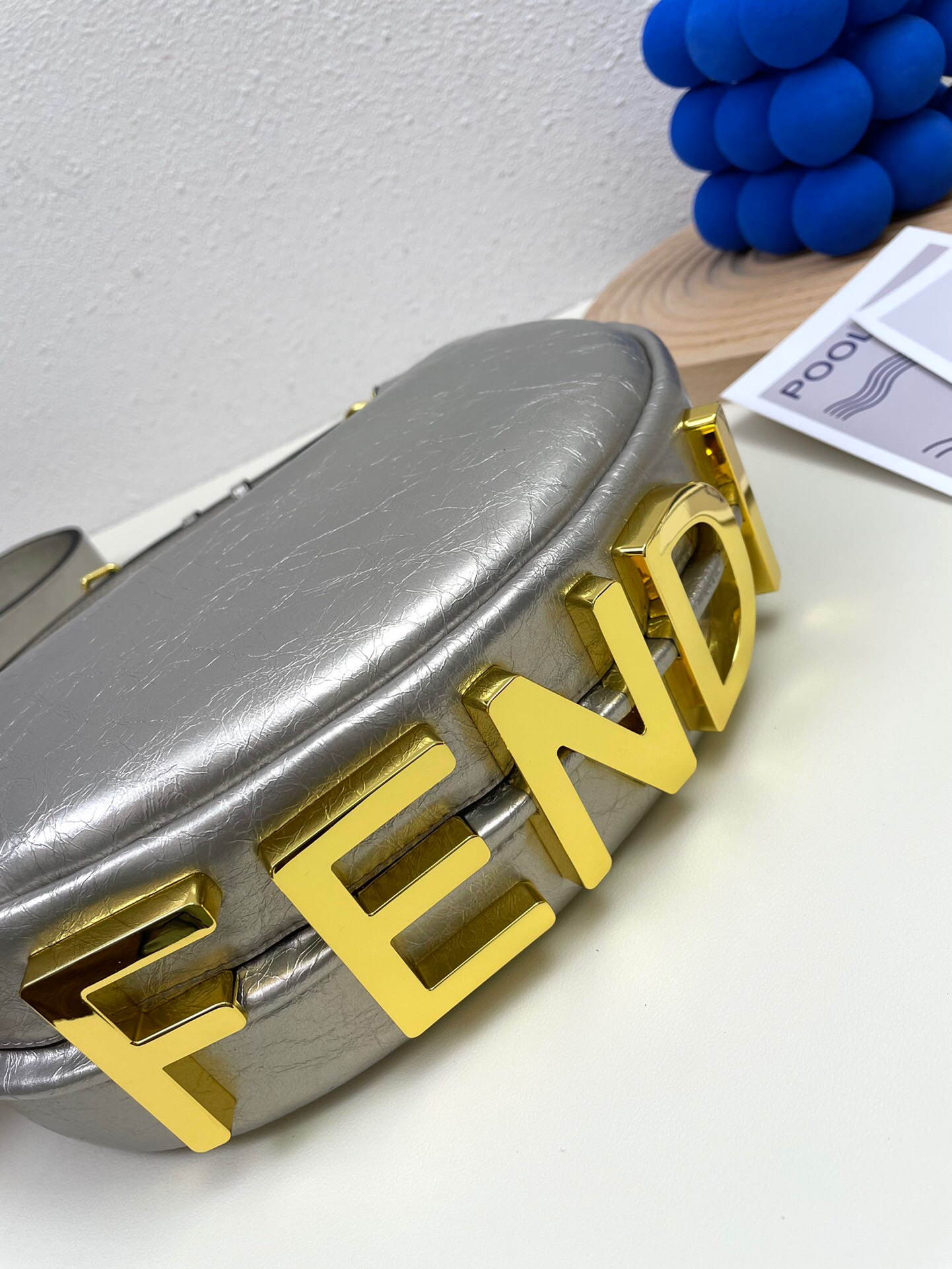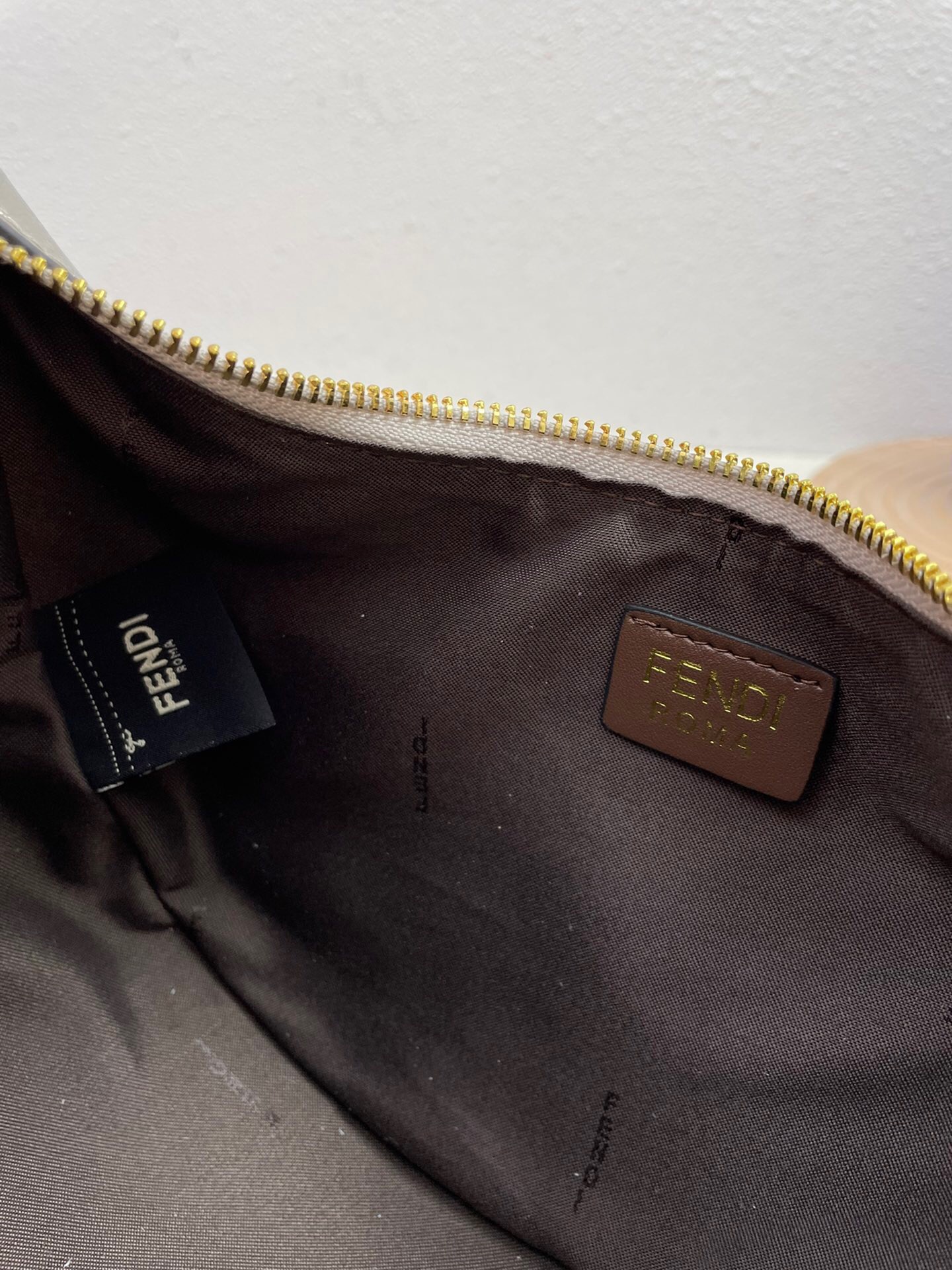 Ela possui detalhes no seu fundo na cor dourada, onde está escrito Fendi, o nome da sua marca.