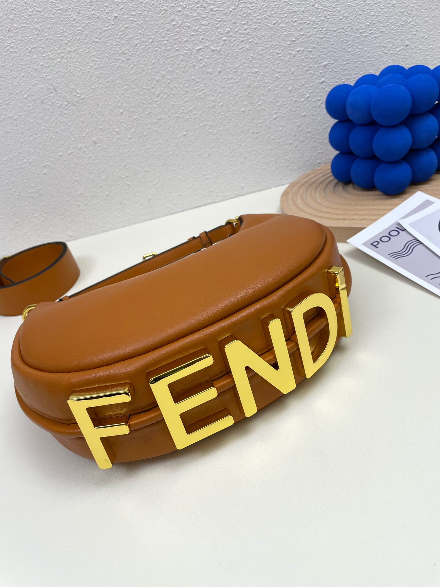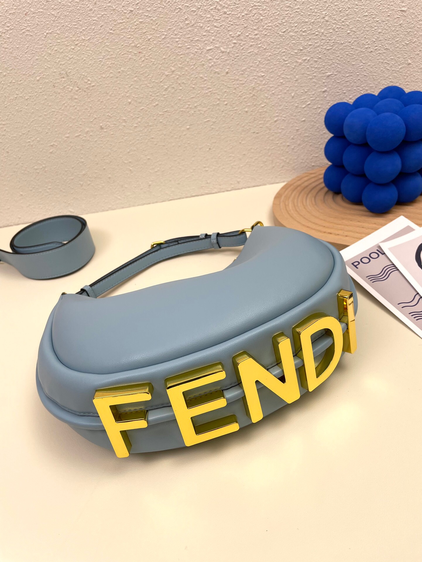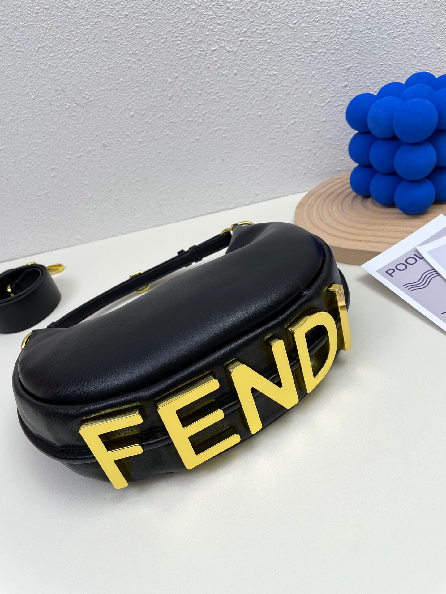 Ela possui detalhes no seu fundo na cor dourada, onde está escrito Fendi, o nome da sua marca.