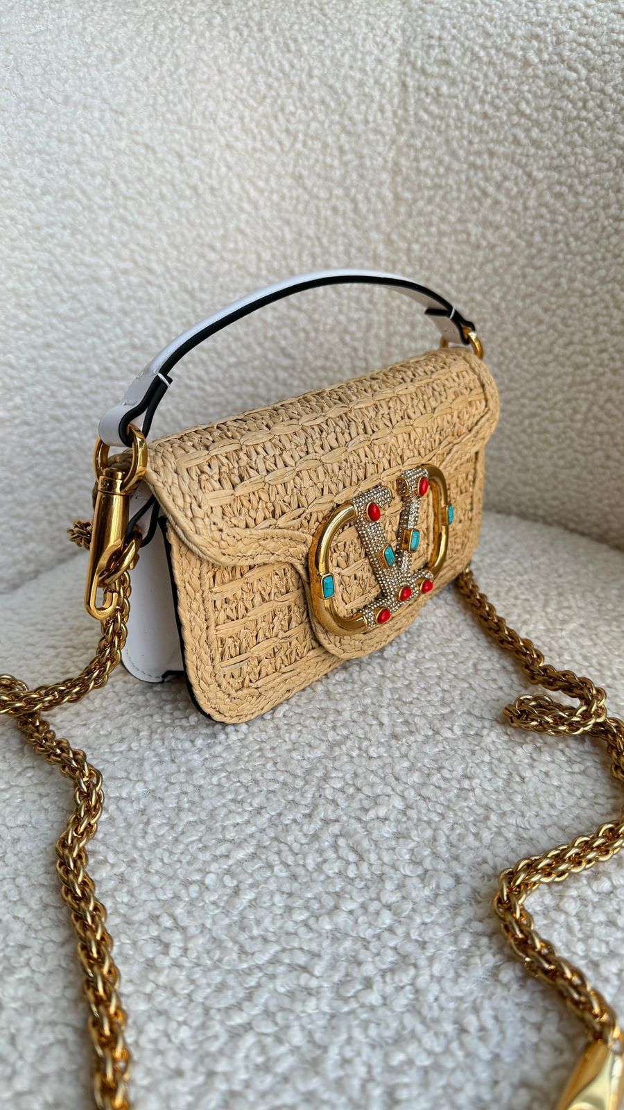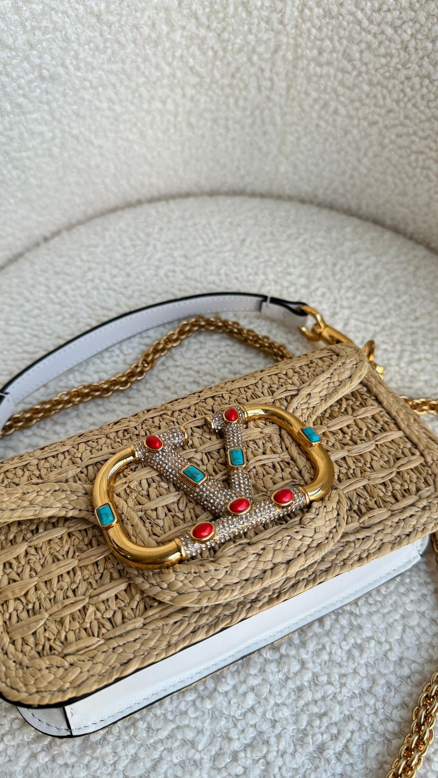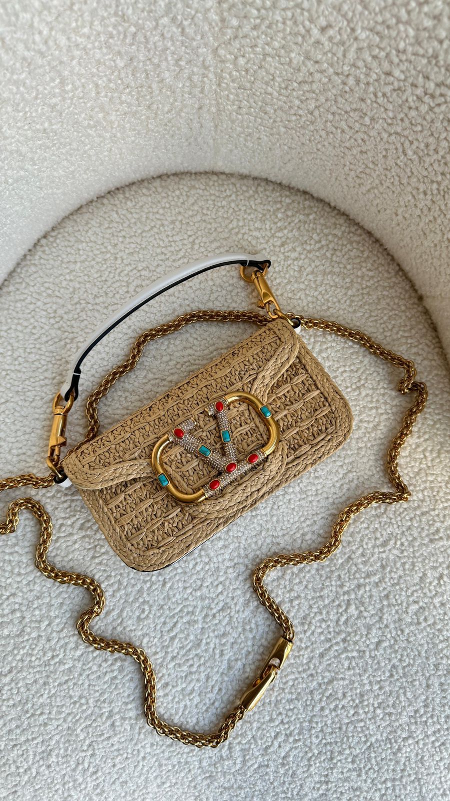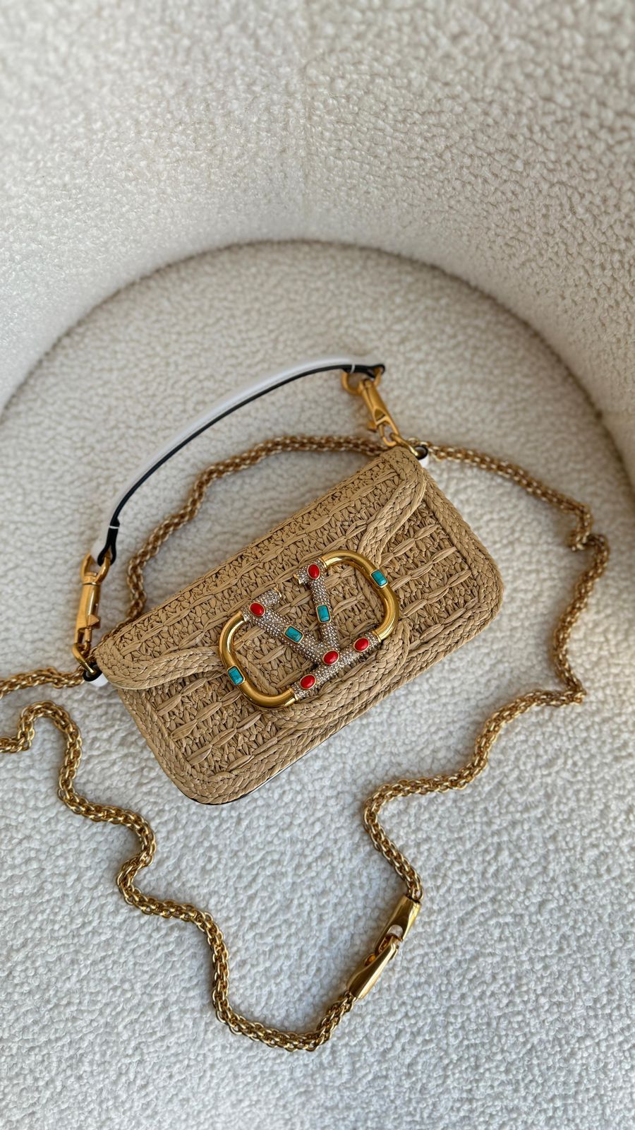 A Bolsa Tiracolo Locò Pequena em ráfia da Valentino Garavani é a escolha ideal para quem busca um acessório sofisticado e elegante. Com um design icônico e contemporâneo, esta bolsa é uma
