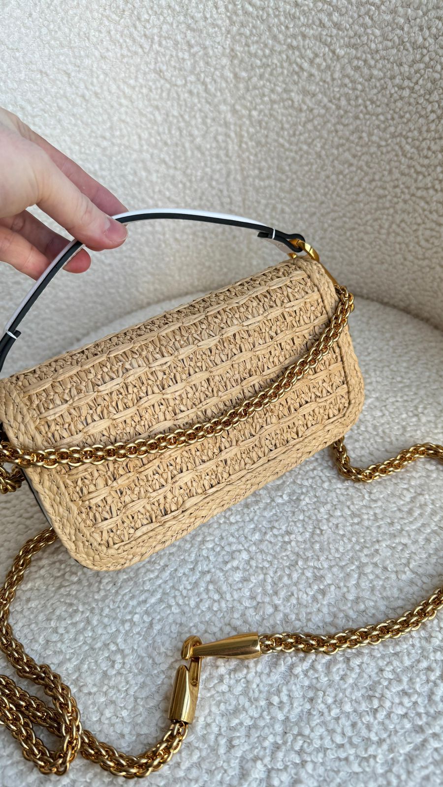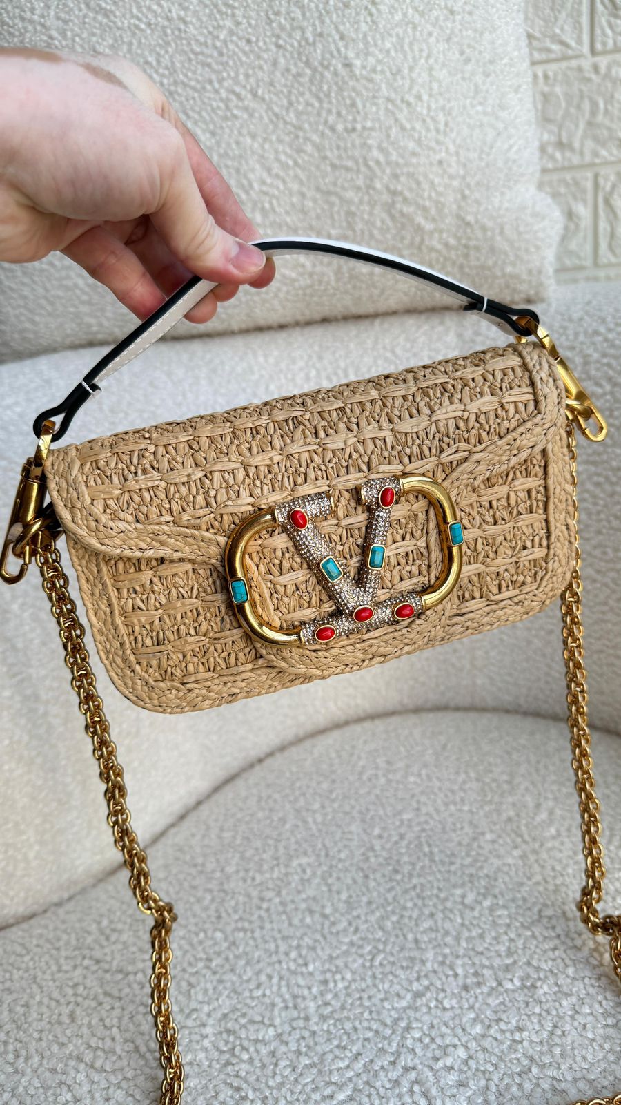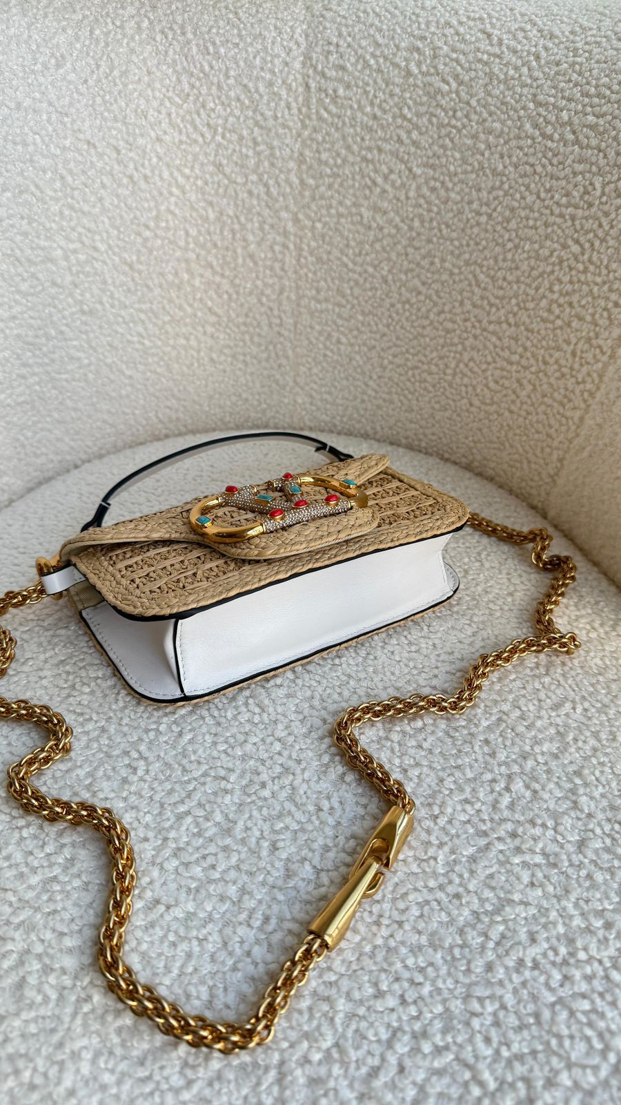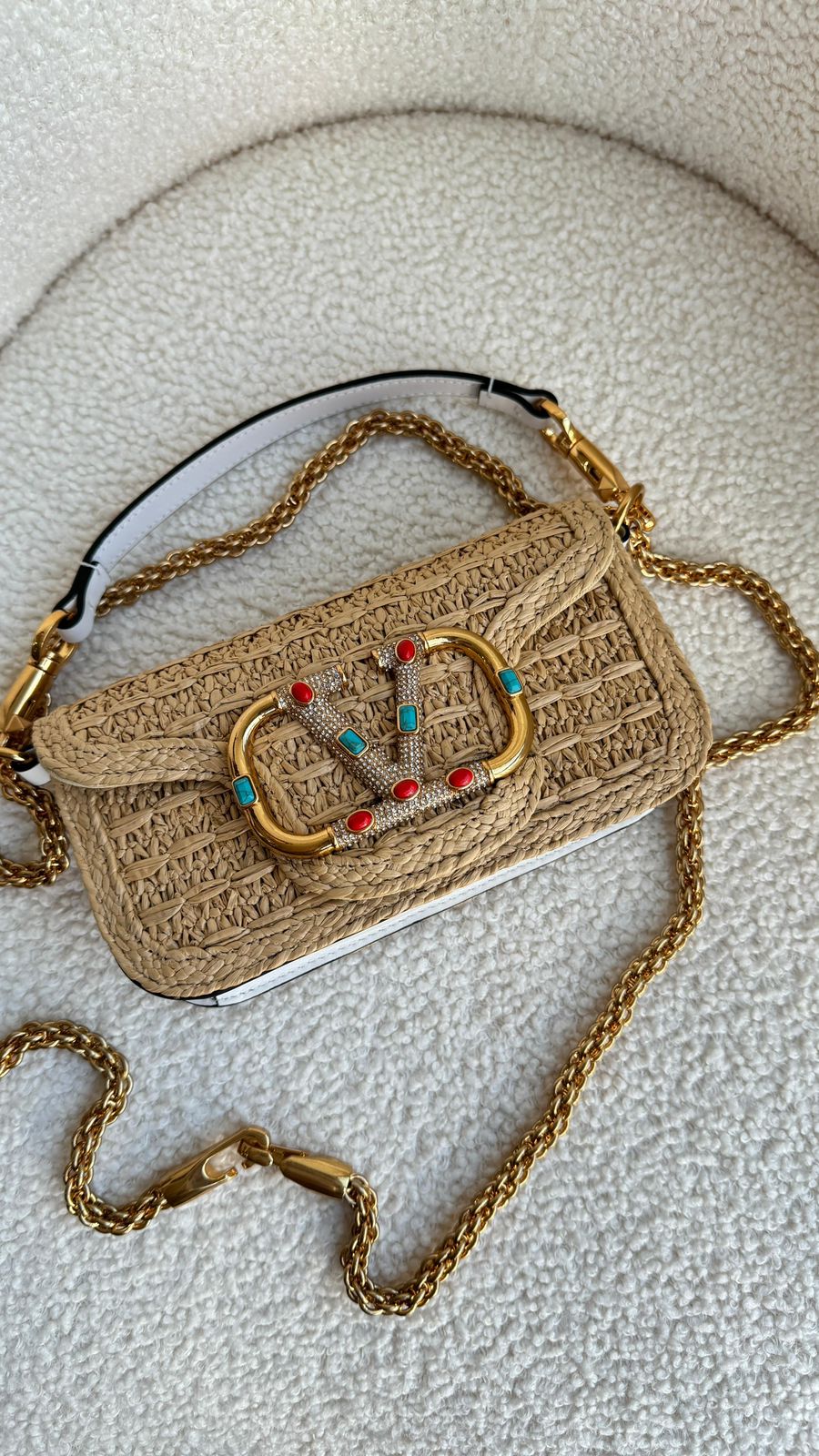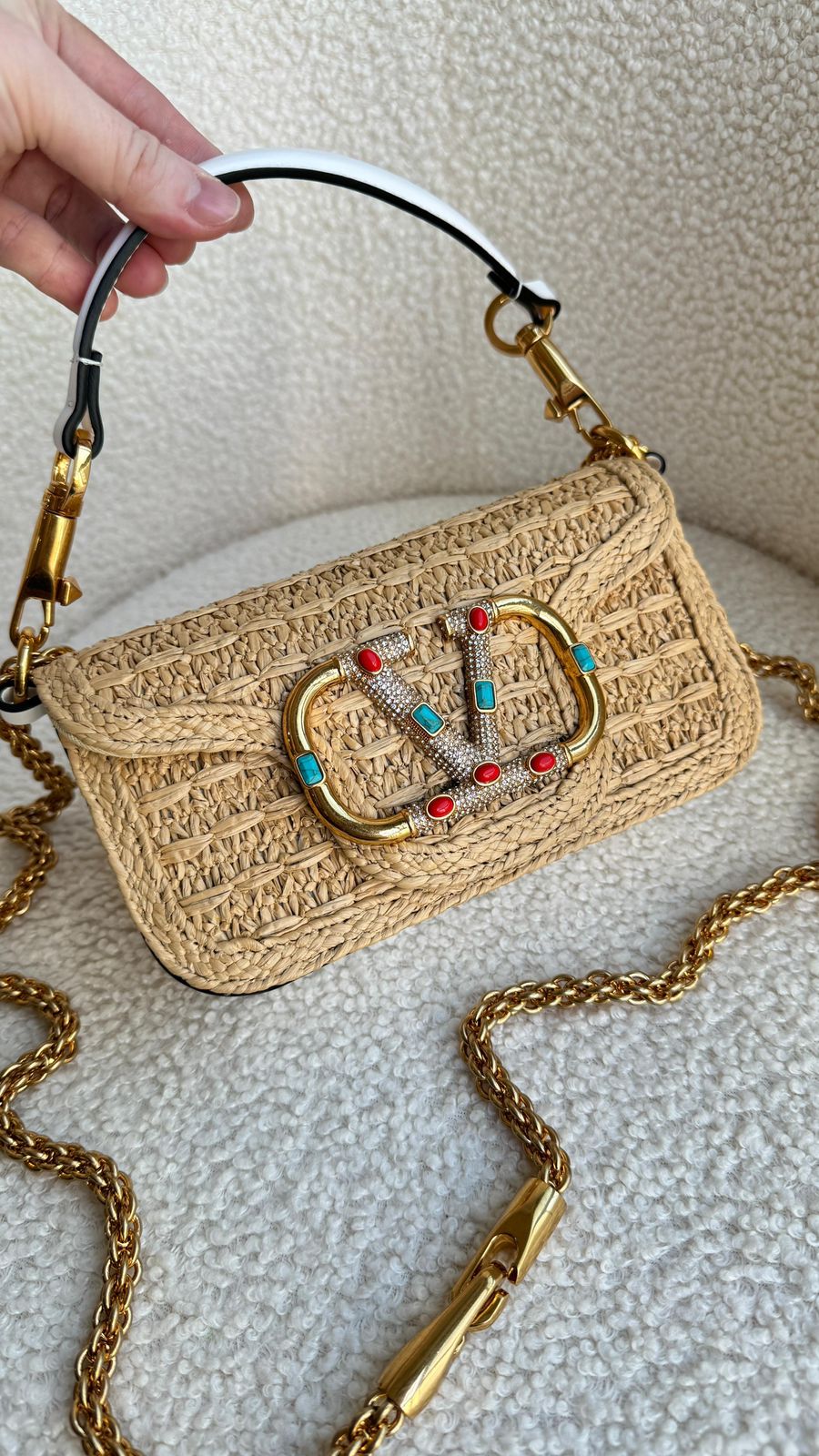 A Bolsa Tiracolo Locò Pequena em ráfia da Valentino Garavani é a escolha ideal para quem busca um acessório sofisticado e elegante. Com um design icônico e contemporâneo, esta bolsa é uma