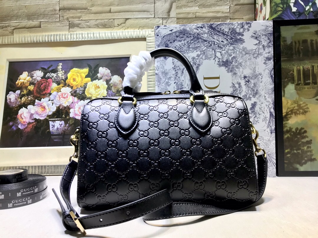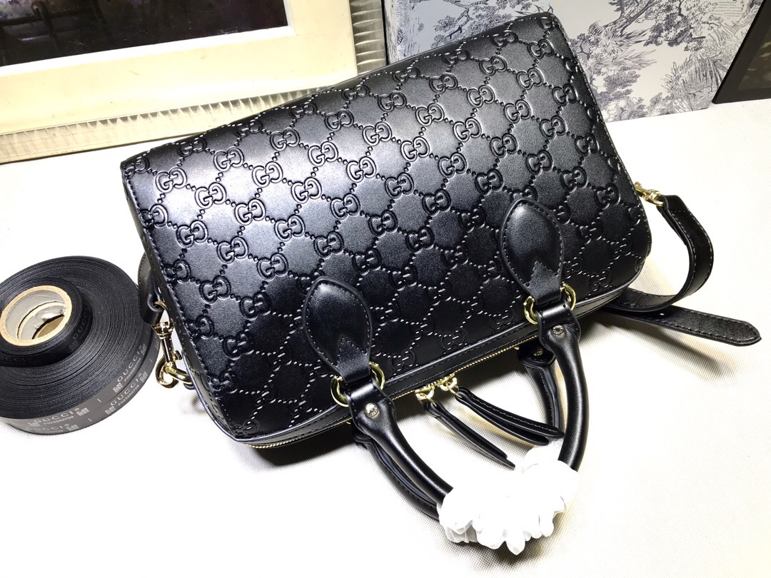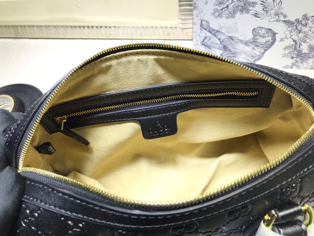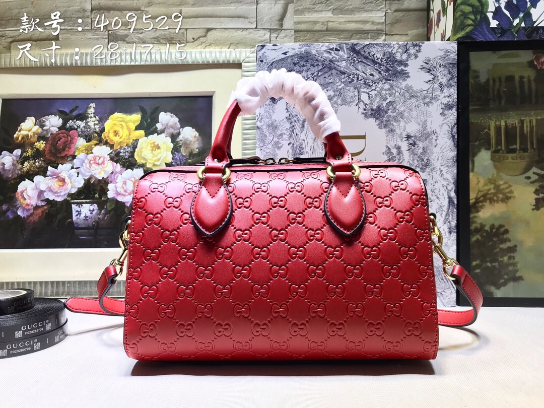 Bolsa Gucci de couro vermelho, relevo monograma Signature, logo frontal e ferragens champagne (dourado clarinho) – Possui alça dupla de mão e fechamento por zíper.