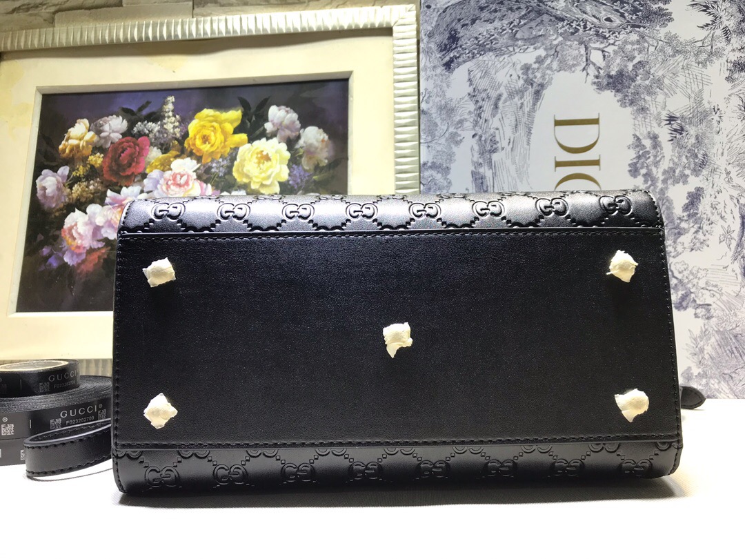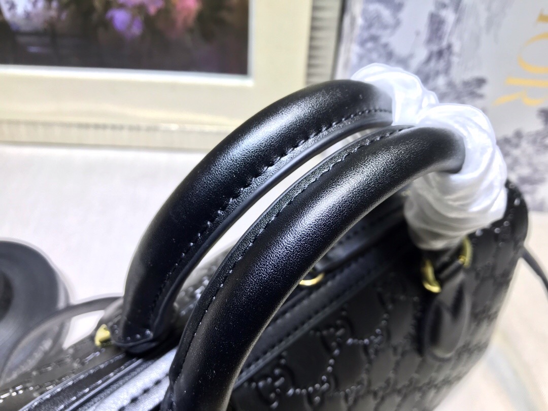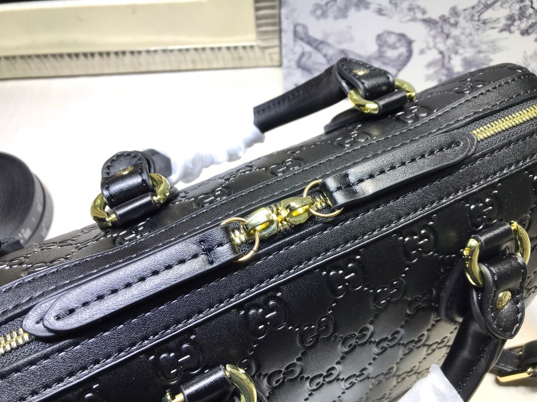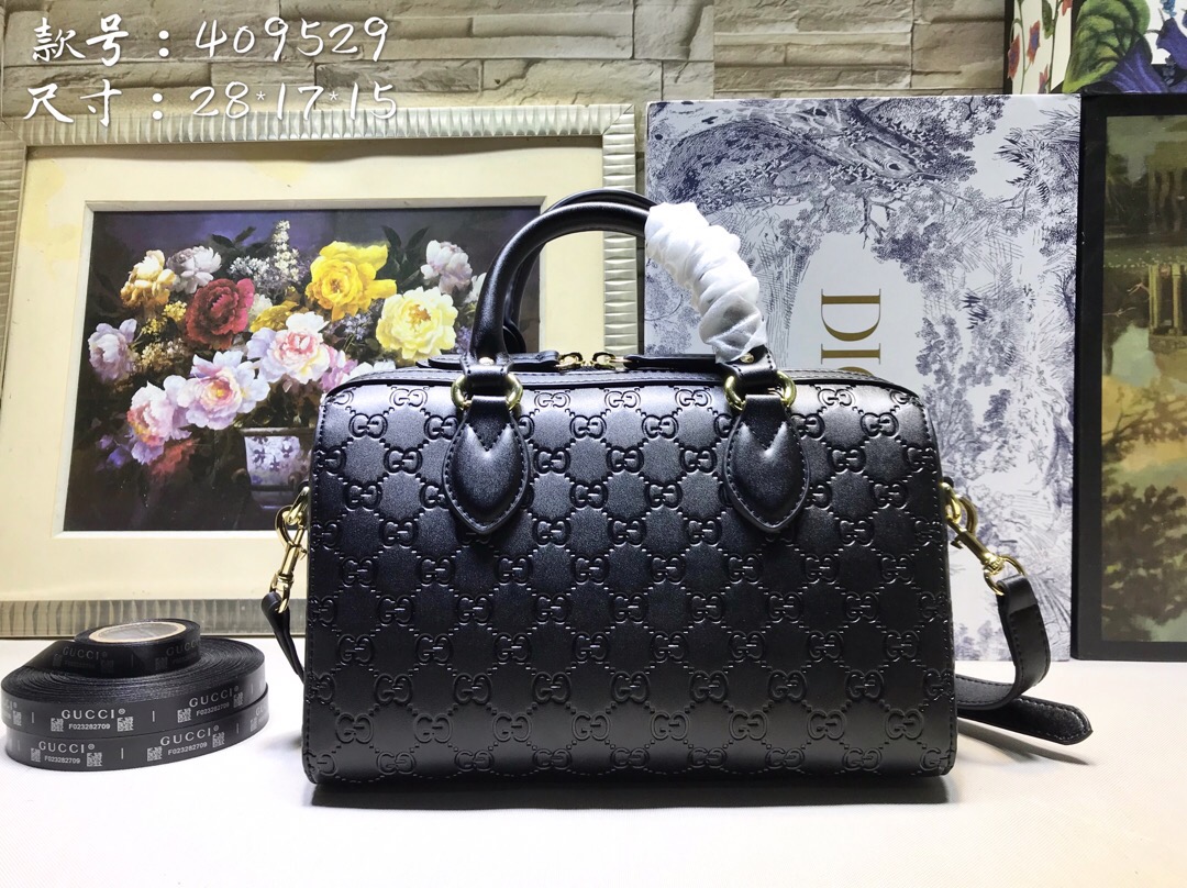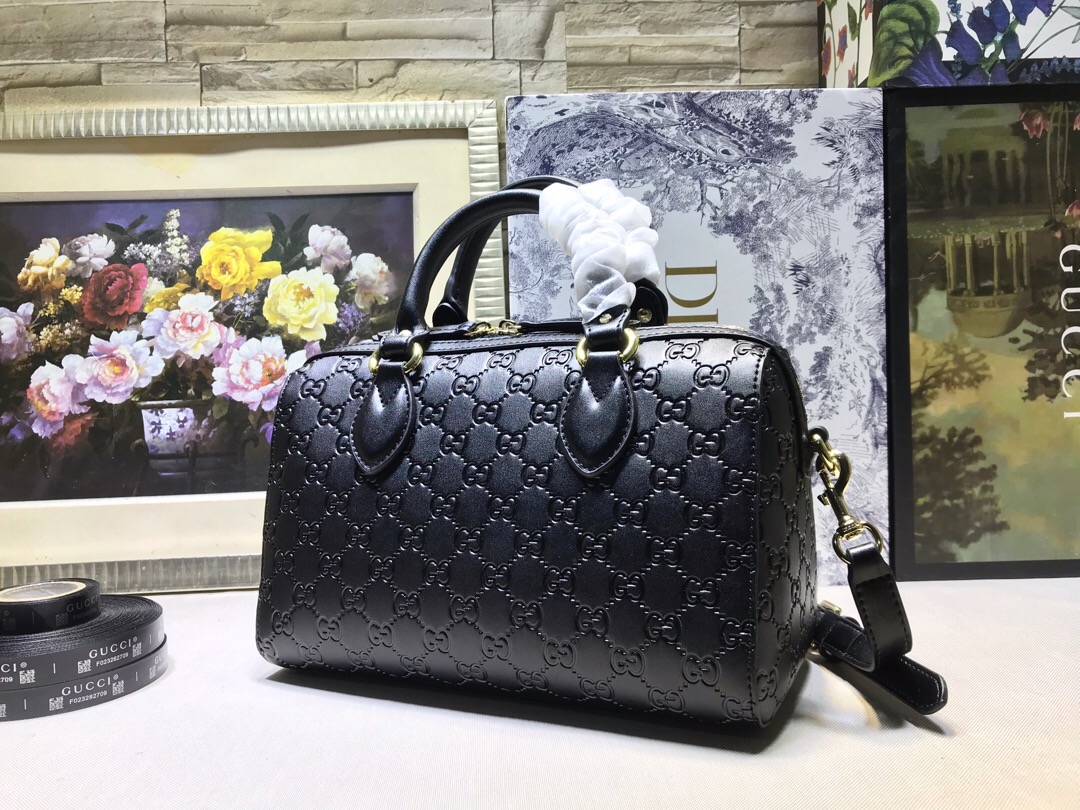 Bolsa Gucci de couro vermelho, relevo monograma Signature, logo frontal e ferragens champagne (dourado clarinho) – Possui alça dupla de mão e fechamento por zíper.