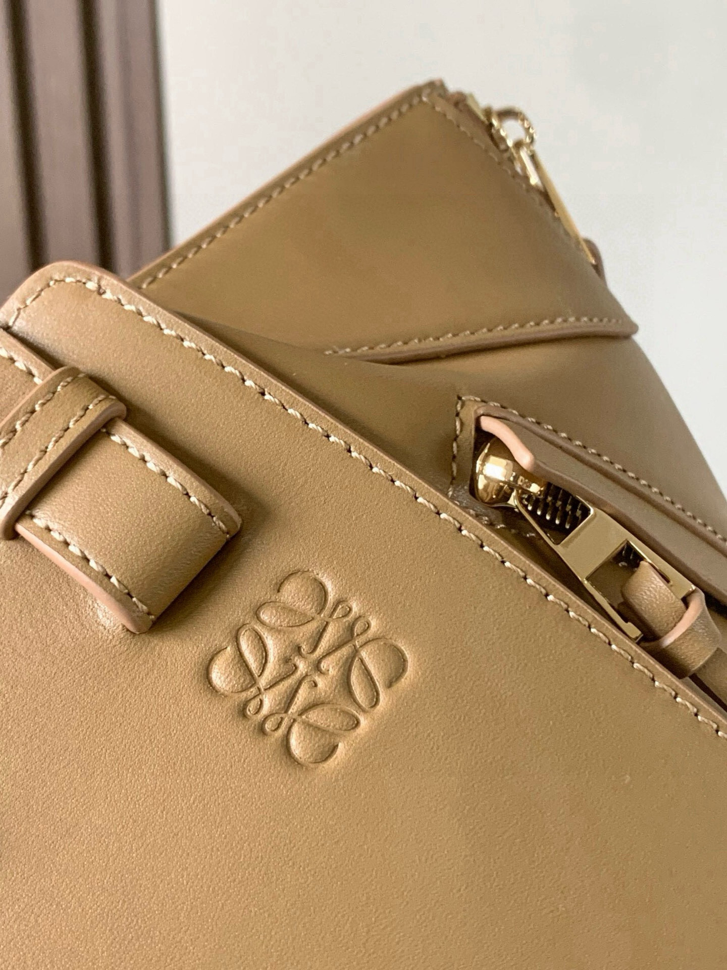 Bolsa Loewe Compact bege réplica italiana possui textura refinada e acabamento sofisticado, garantindo durabilidade e um visual elegante.
