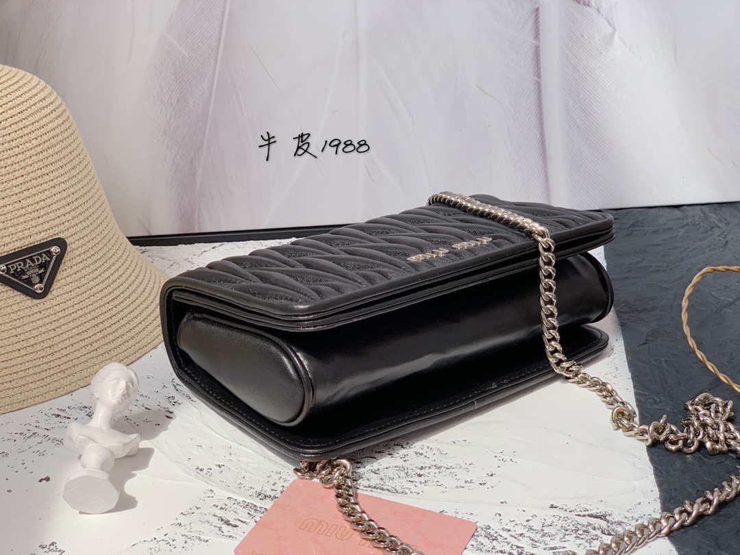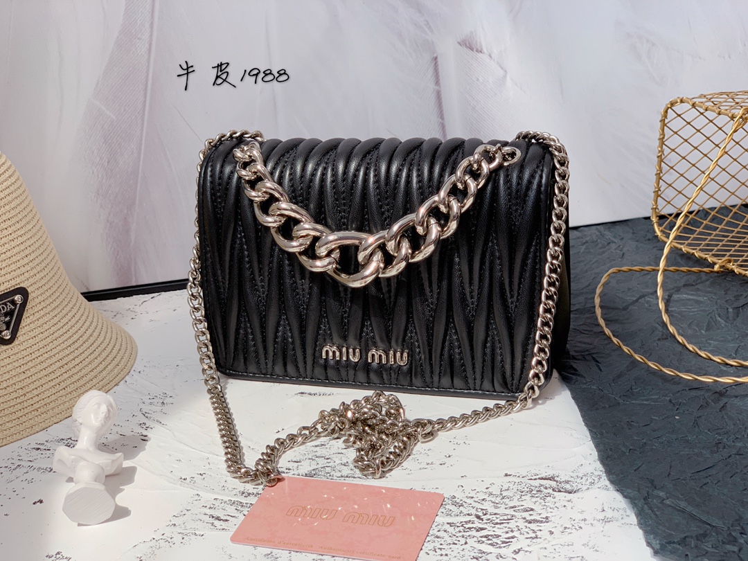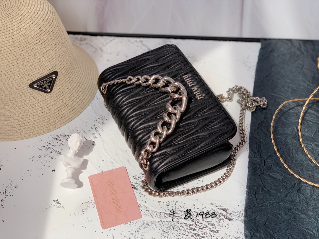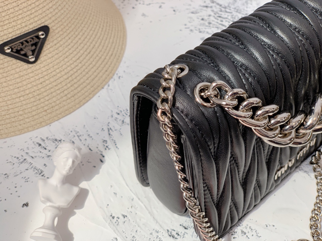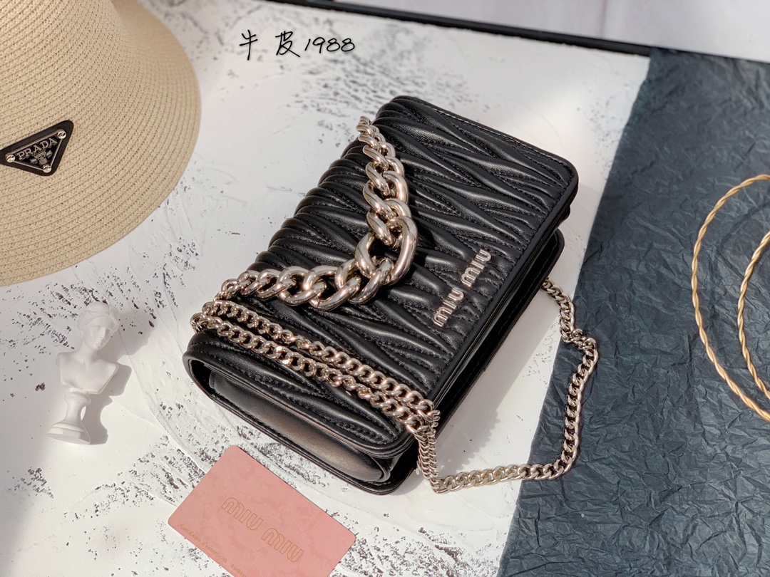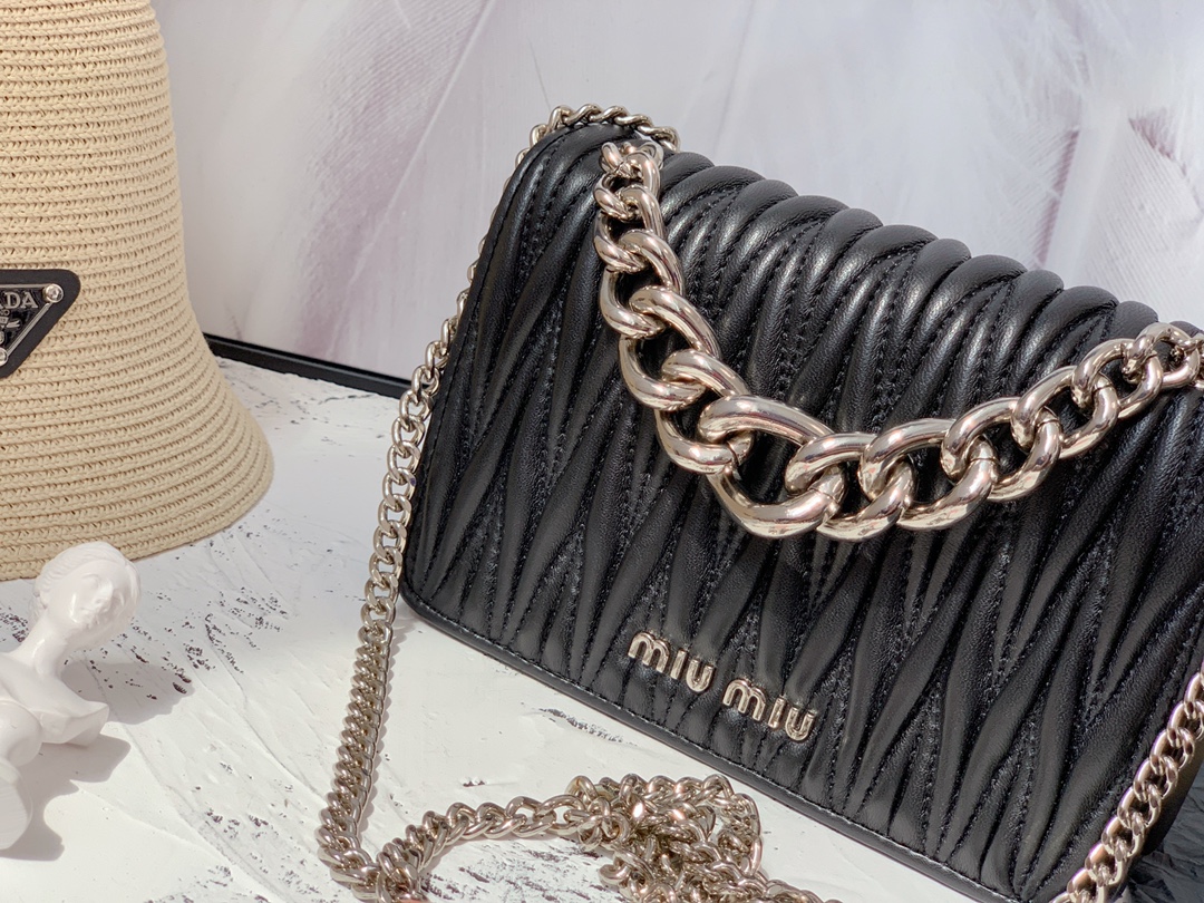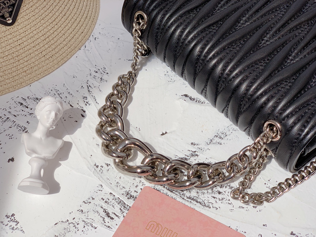 Um dos traços distintivos da Bolsa Miu Miu Leather Chain é a corrente metálica que serve como alça ou detalhe decorativo, proporcionando um toque de sofisticação industrial ao design. Essa característica contrasta com a suavidade do couro, criando um visual único e atraente.