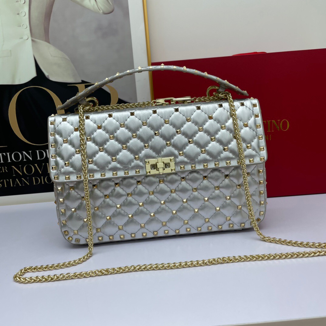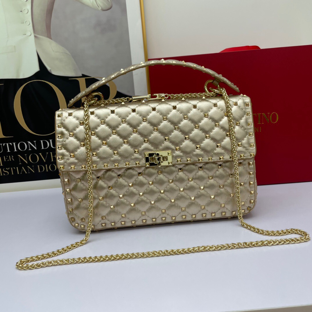 Valentino Garavani Rockstud Spike é revestida em couro legítimo, com detalhes em pontos com metais dourados antioxidantes. Com a alça fixa no modo “handle”, e também acompanha a alça removível, em metal antioxidante em dourado, o que exalta o luxo da bolsa. Disponível em 7 cores maravilhosas da coleção Rockstud Spike. Sua medida é de 30 x 20 x 8,5. O tamanho perfeito para causar nas ruas ou nas baladas pela
