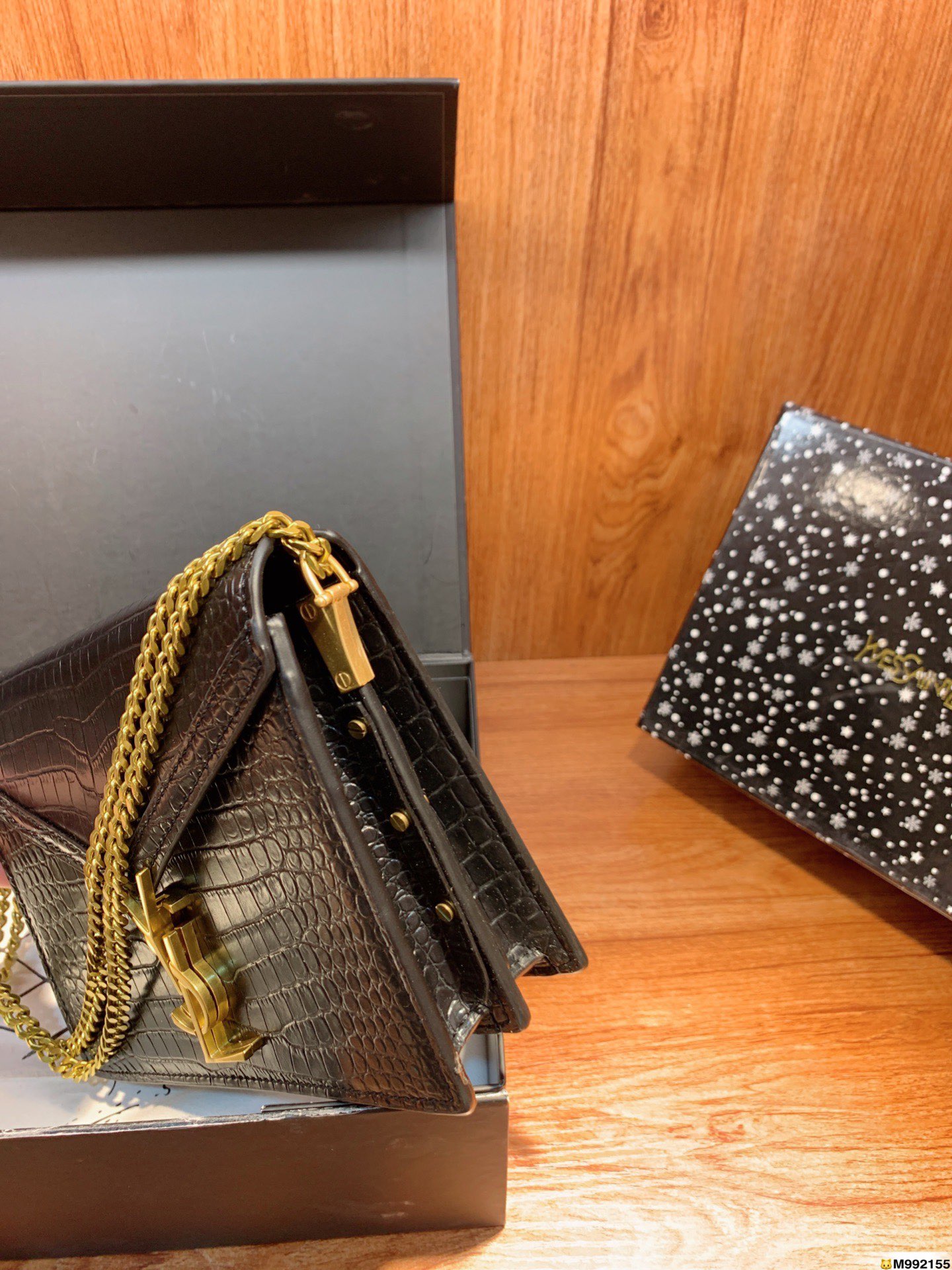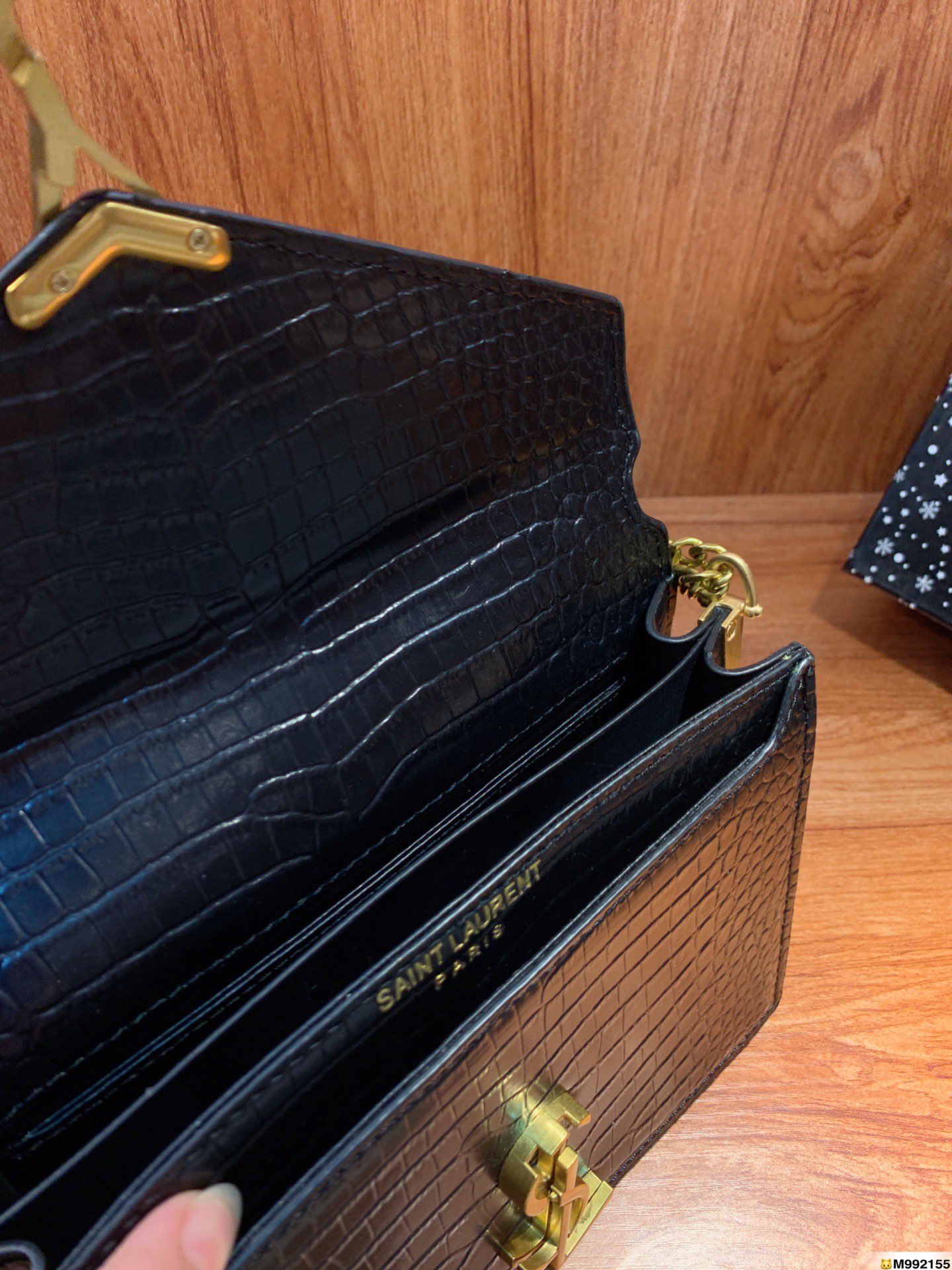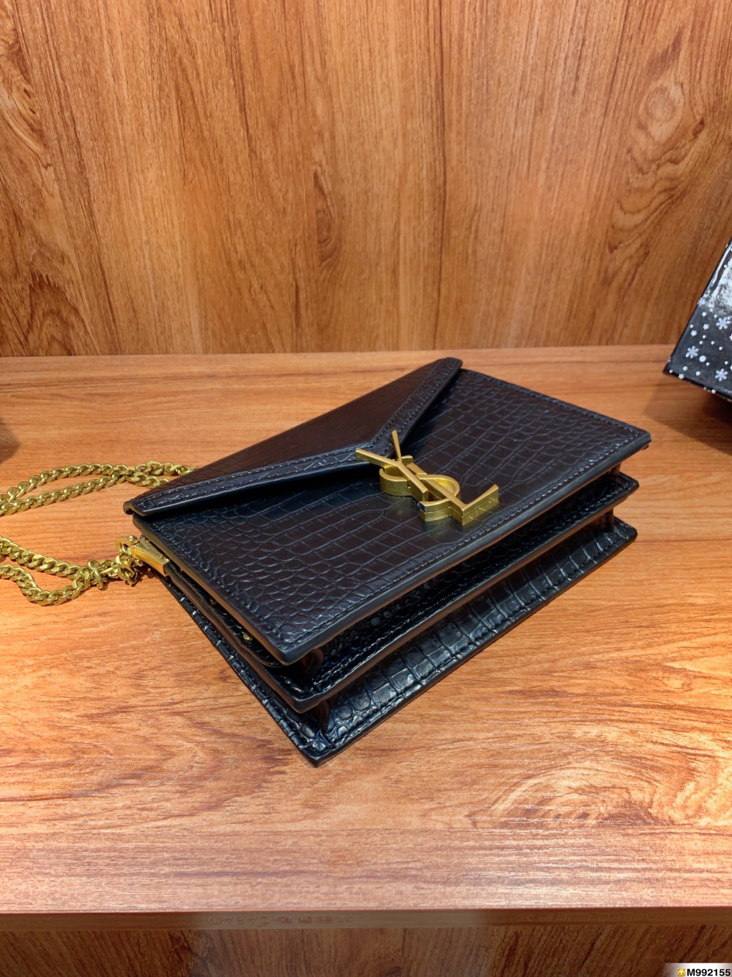 A logo da marca YSL em dourado metalizado e em relevo, é o fecho da bolsa bem ao centro do produto. Sendo assim, considerado uma bolsa de tamanho pequeno. Porém, a elegância e o requinte são enormes e o poder de sedução que nela contém, maior ainda.