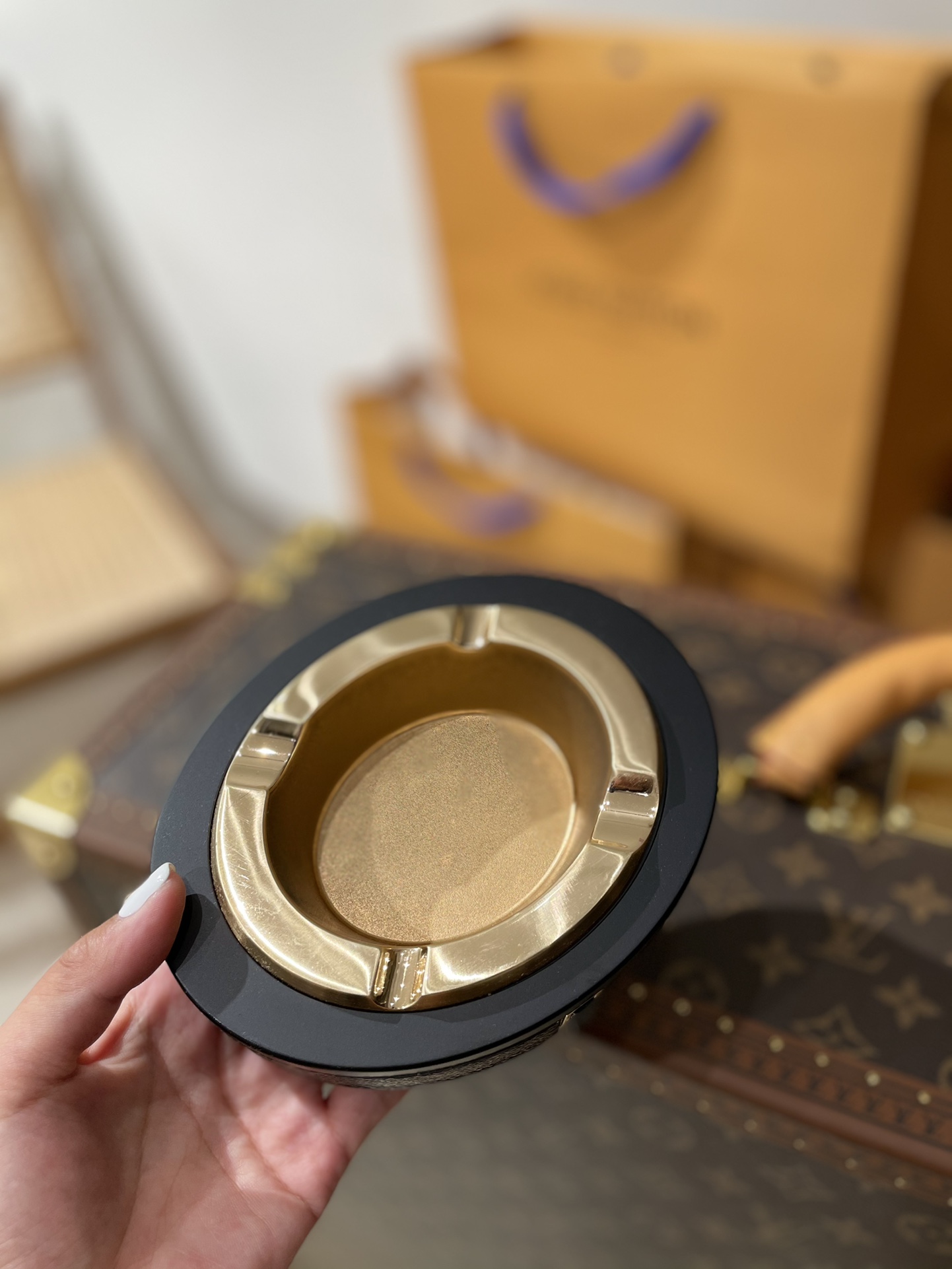 O cinzeiro é da marca mais conhecida no mundo, a Louis Vuitton. Ele é uma peça que pode ser colocada na mesa, braço do sofá, mesa de centro, entre outros lugares.