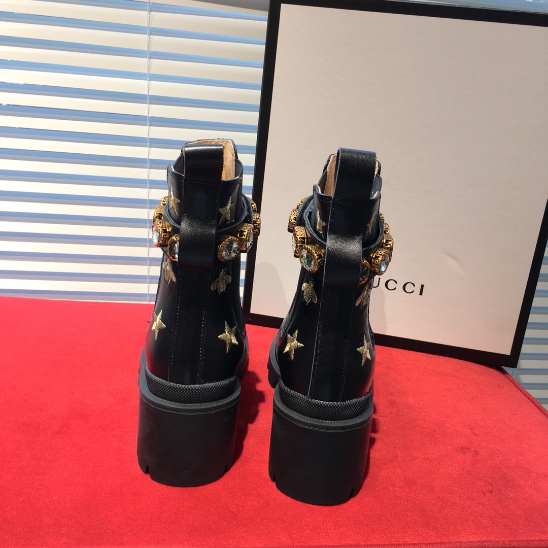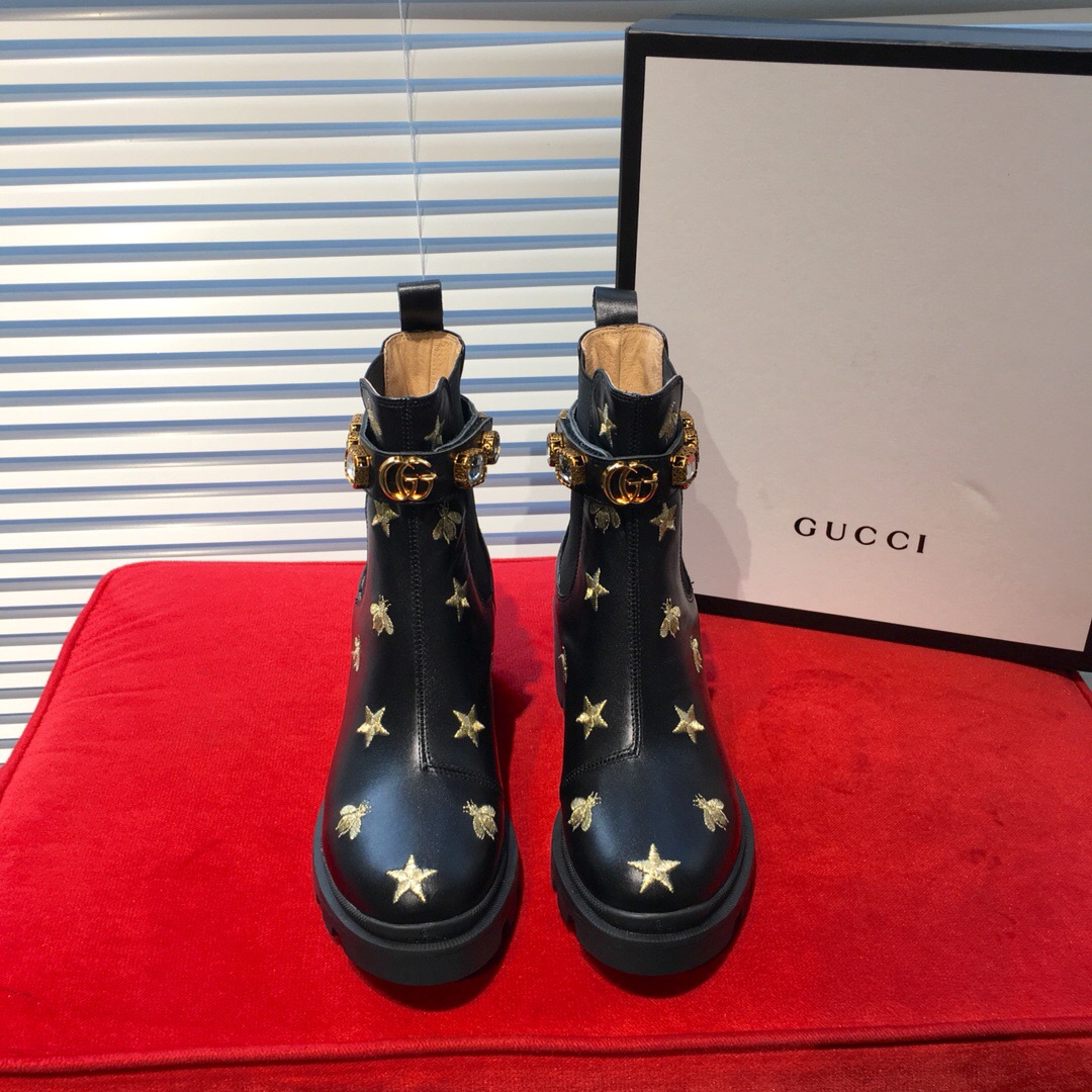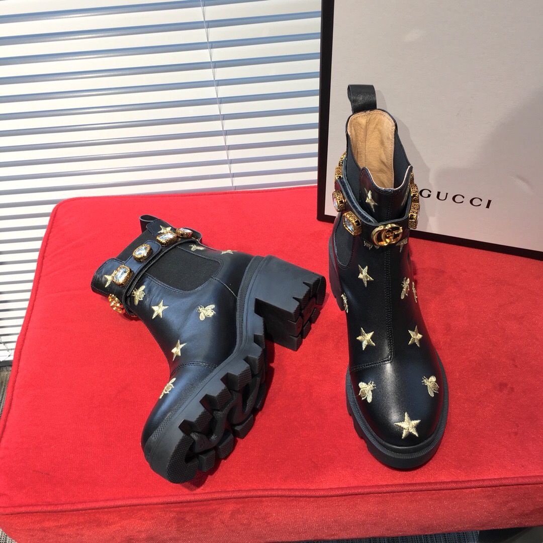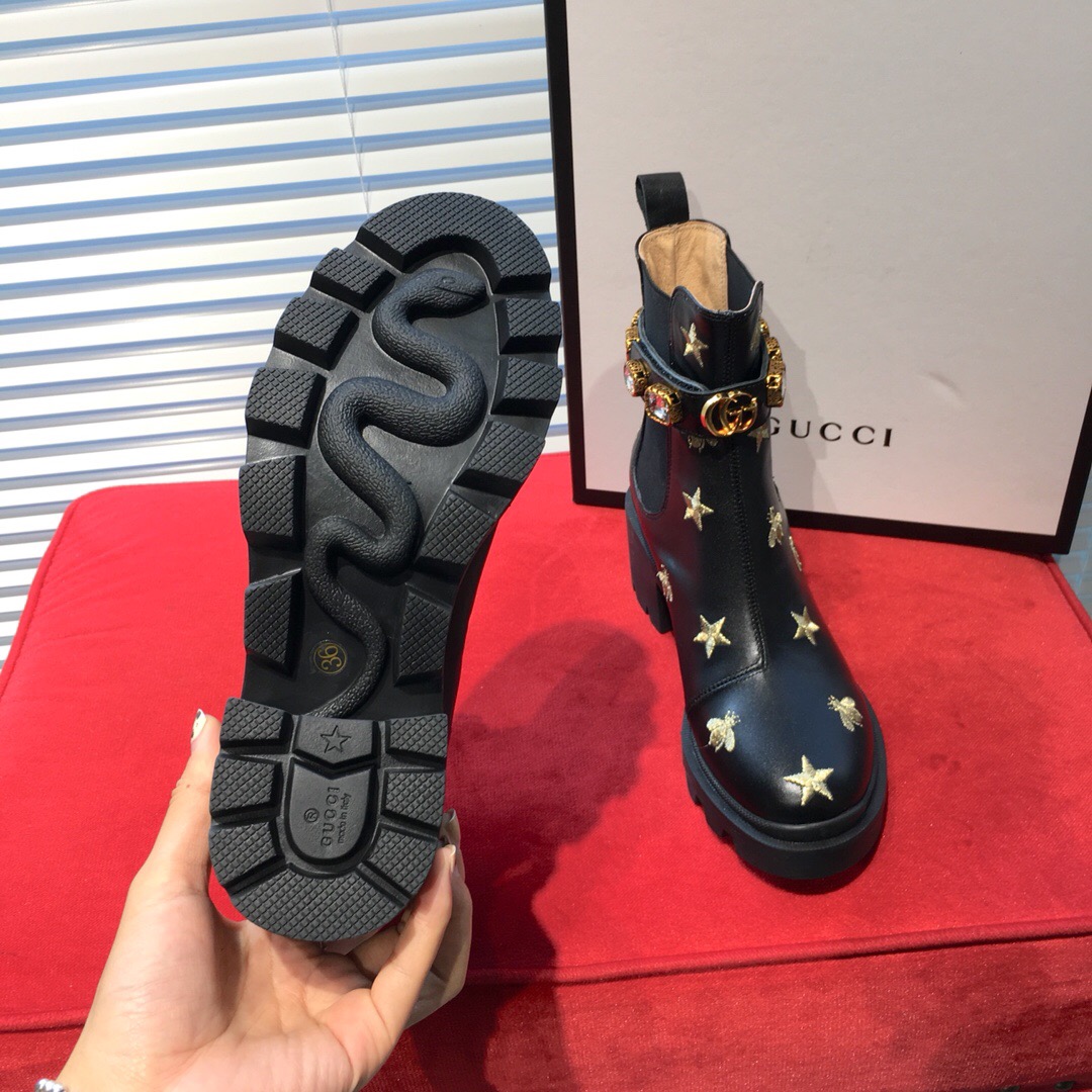 Essa ankle boot em couro preto bordado é feito com solado robusto e possui aplicações elásticas em cada lado para uma entrada pull on, completada com uma tira para calcanhar removível com acabamento de cristais brilhantes relembrando joias vintage. O emblemático Double G decora a parte frontal. Possui bordado de abelhas e estrelas em dourado. Salto com plataforma de 6,25 cm.