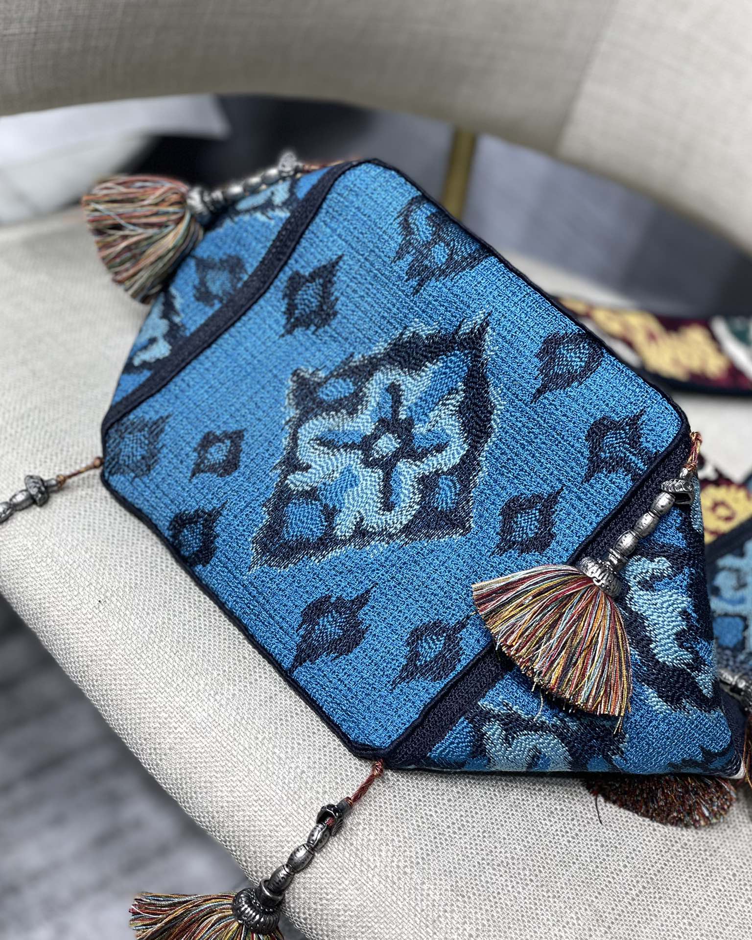 O formato “bag” da bolsa garante facilidade ao carregar os seus pertences no dia a dia. A bolsa conta com uma estampa abstrata nas cores azul, dourado e vinho e pompons pendurados ao longo da bolsa.