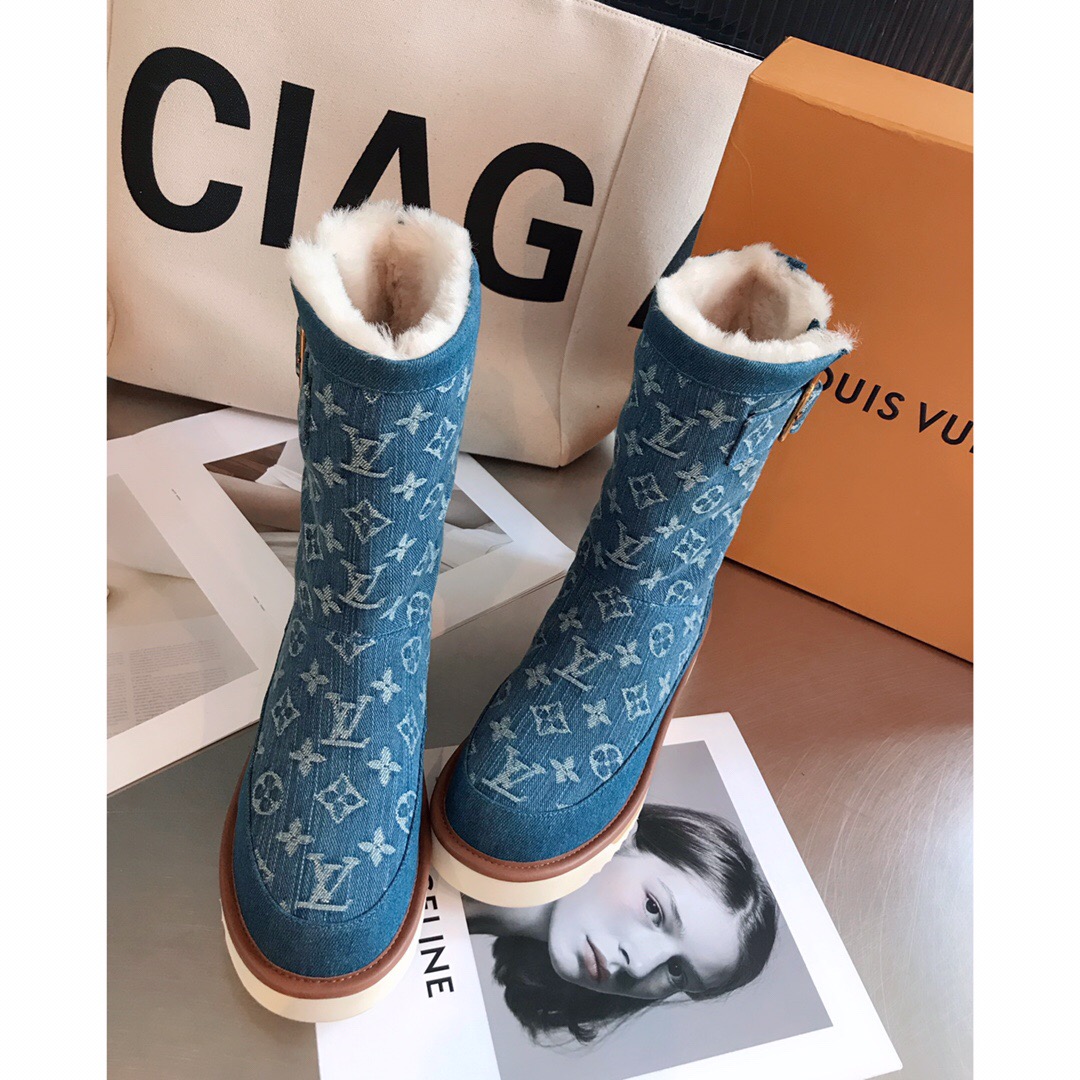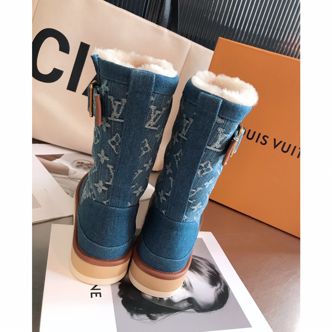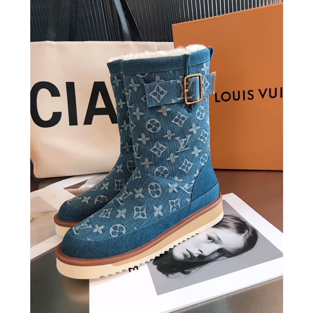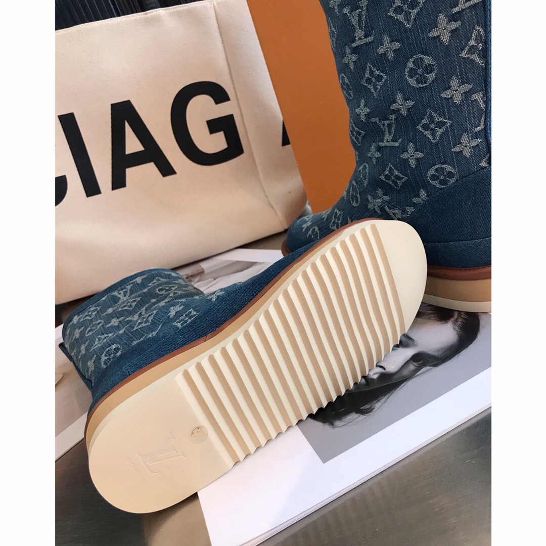 A bota é estilizada com jeans azul, e uma estampa característica da Louis Vuitton, deixando a peça com a cara da grife.