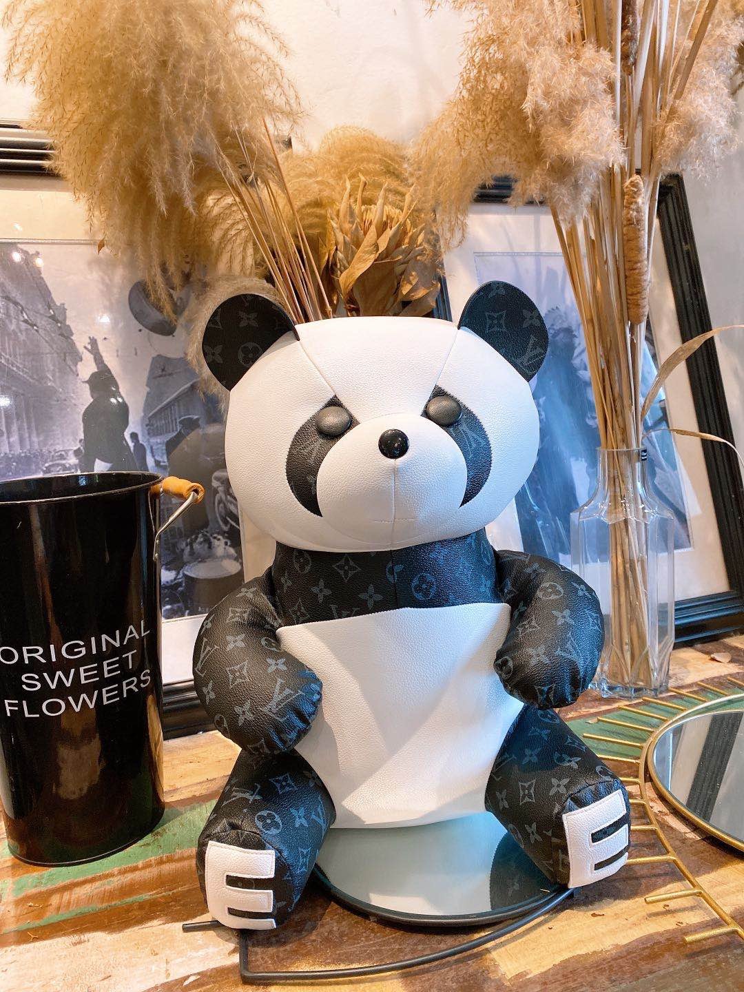 Feito em couro legítimo, o Bell possui costuras fortes, com detalhes o monogram estampado por todo ele. Além disso, a sua cor é preta e branca ou marrom, deixando o urso ainda mais charmoso.