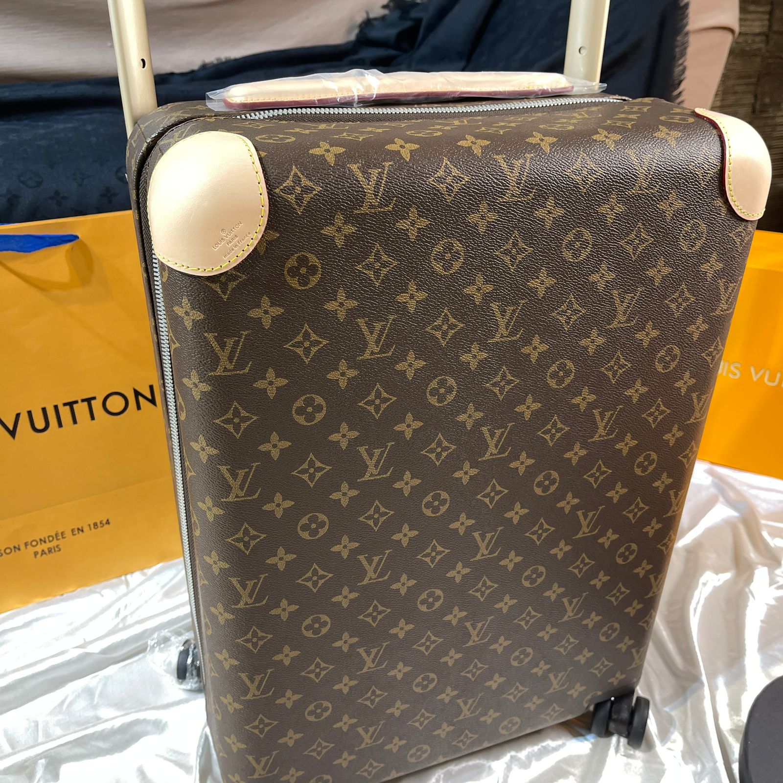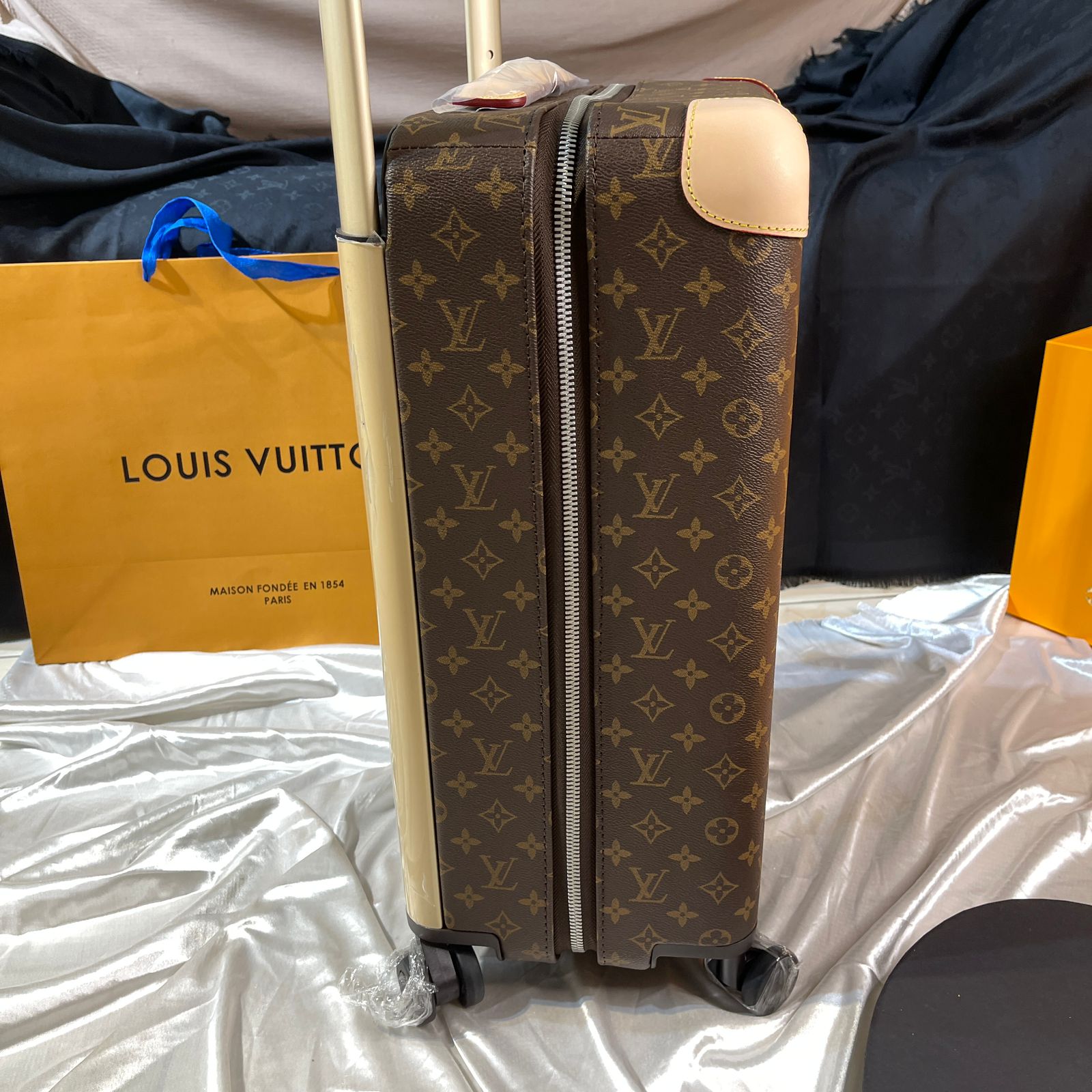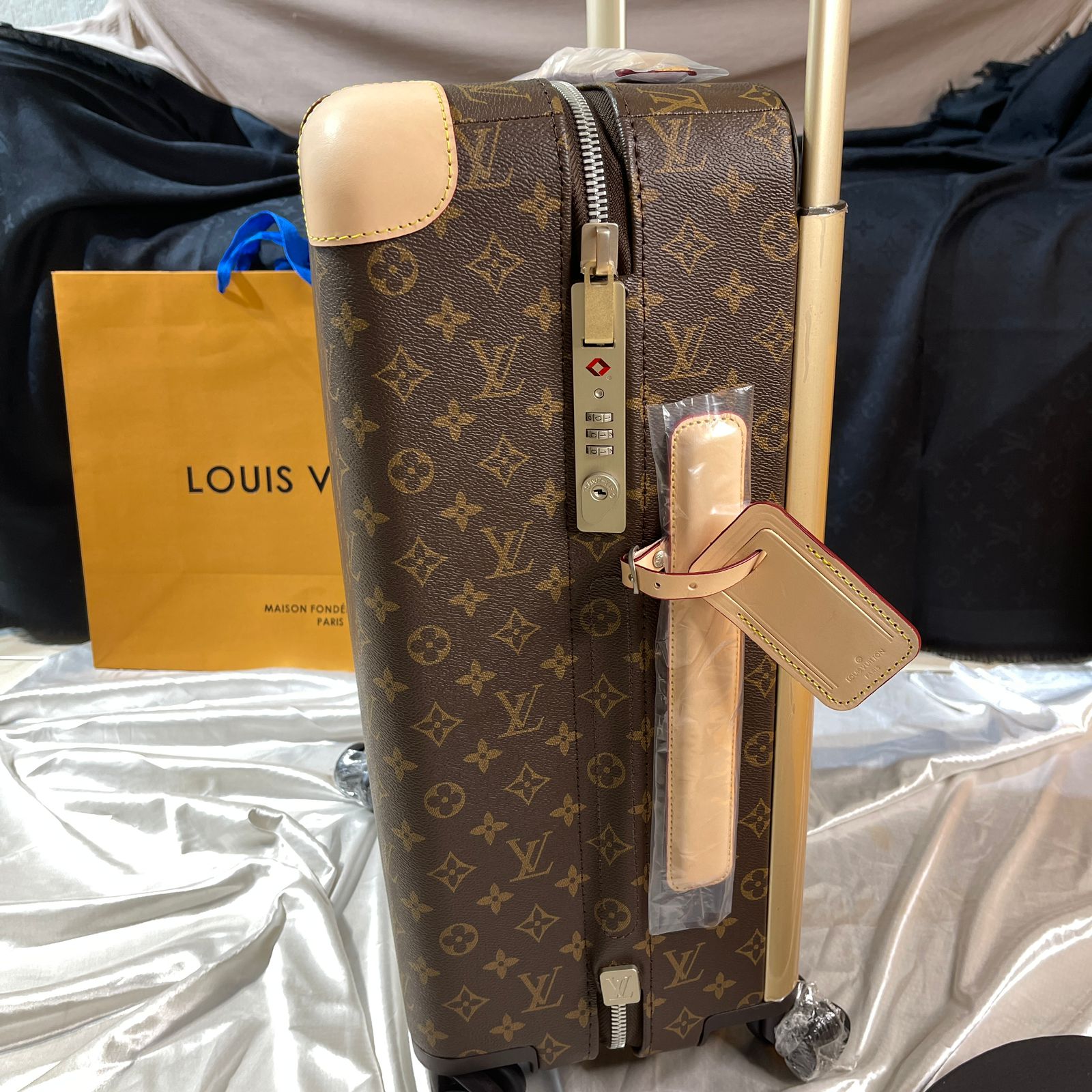 Mala feita de fibra com os acabamentos em couro, cadeado com segredo.