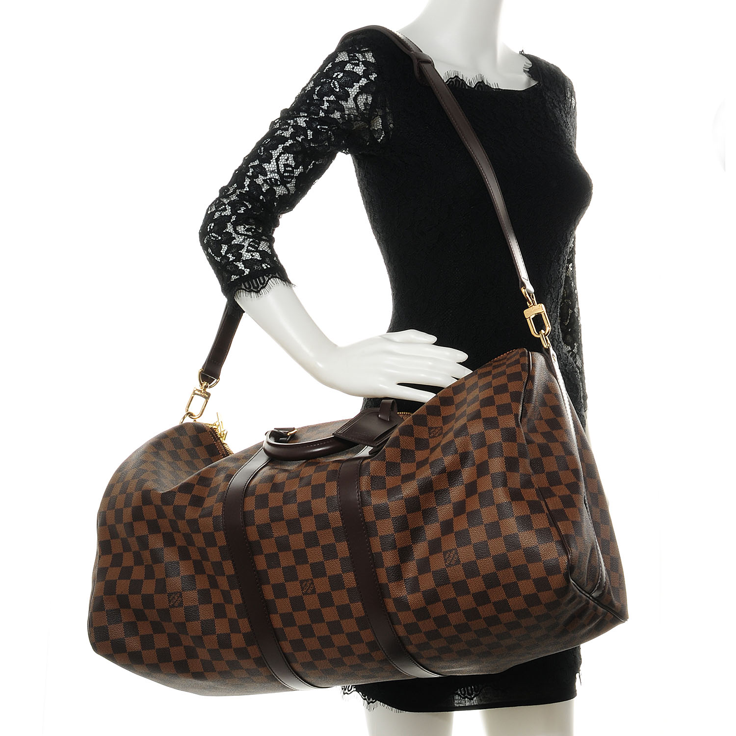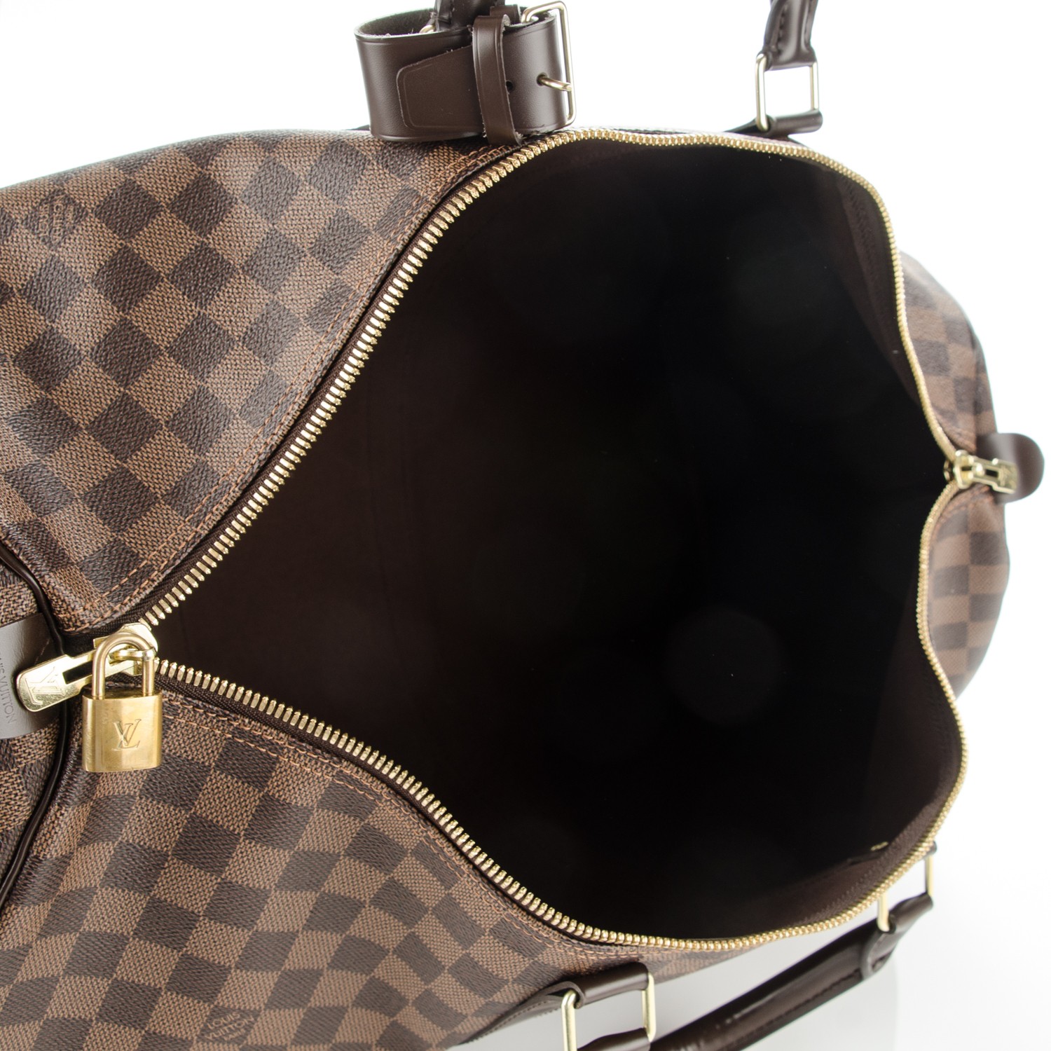, a Keepall é feita em canvas Monogram ou Damier Ebene e acabamento em couro Vachetta. Possui fechamento por zíper, alças de mão duplas e compartimento único.