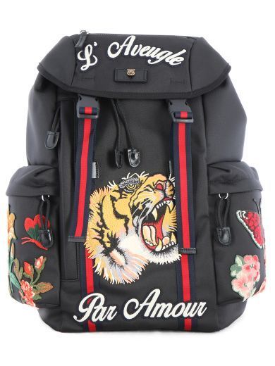 Essa ilustre mochila importada de alta qualidade,a L’aveugle Par Amour tiger modelo italiano da exclusivíssima grife italiana Gucci, está disponível na cor preta e com seu material principal poliéster.