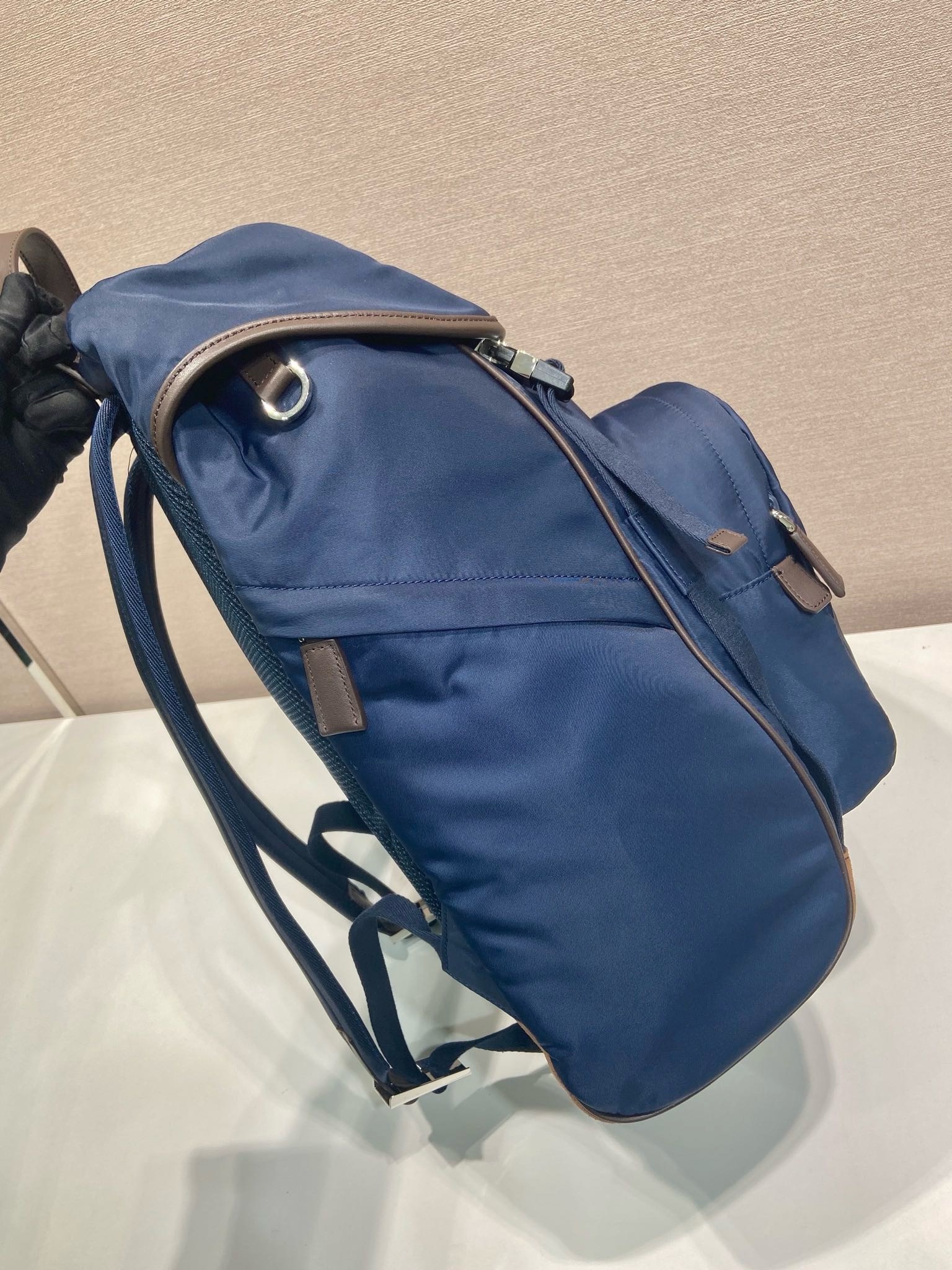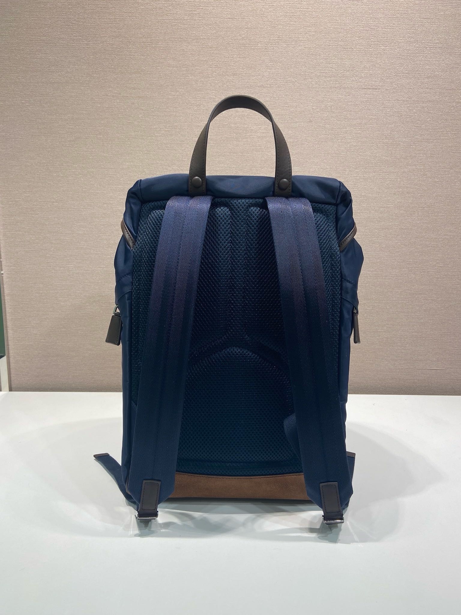 Mochila Prada Re-Nylon Azul Marinho com Alças em Couro – Réplica Italiana Premium