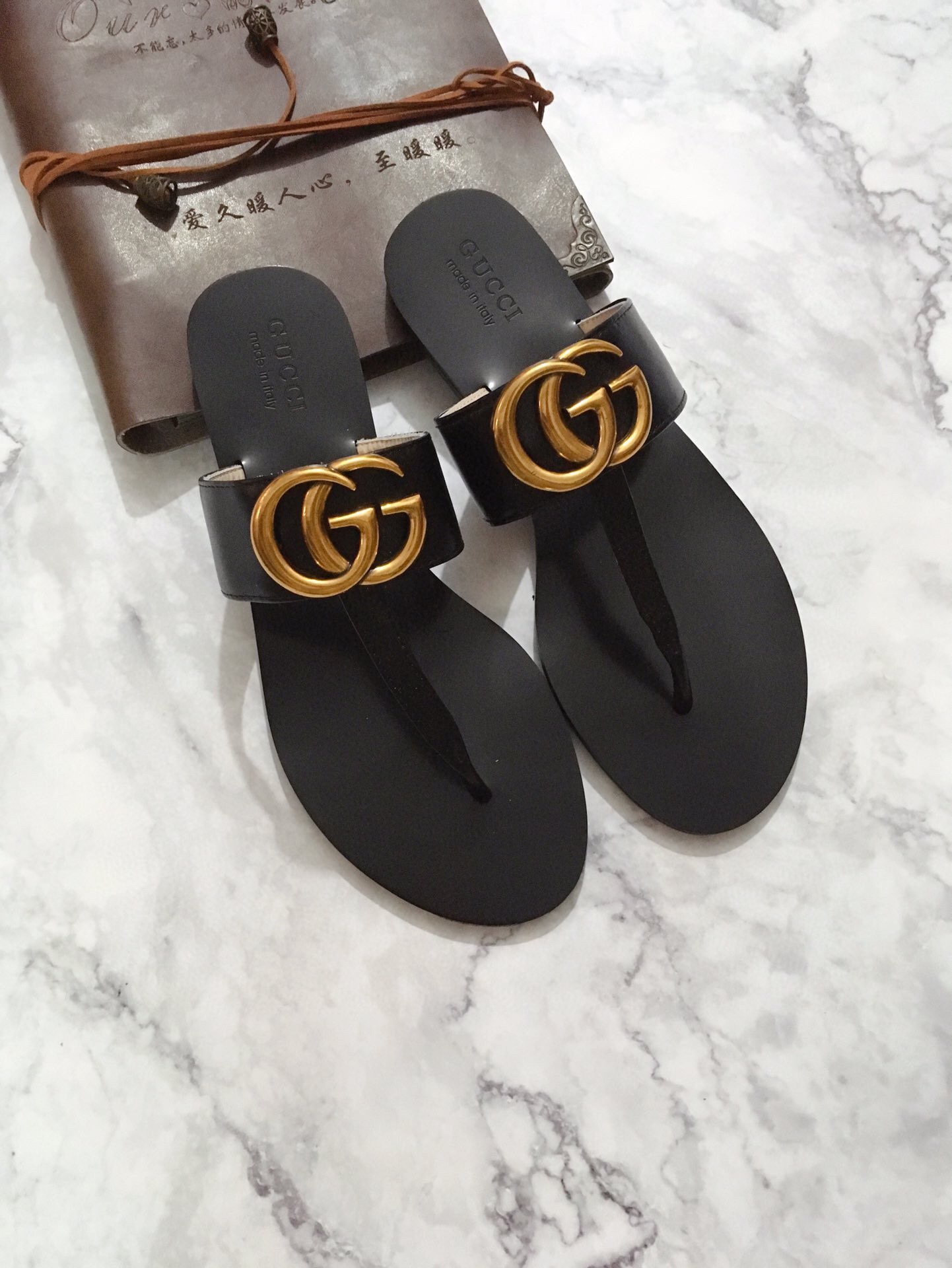 Sandália rasteira de couro preto enriquecida com ferragem do logo Duplo G. Possui solado de couro. Feita na Itália.