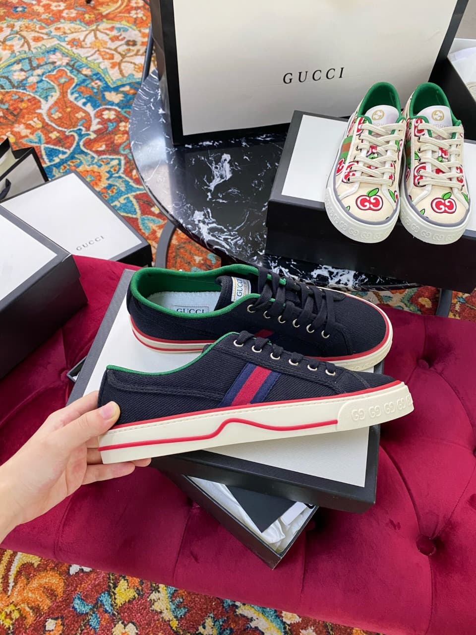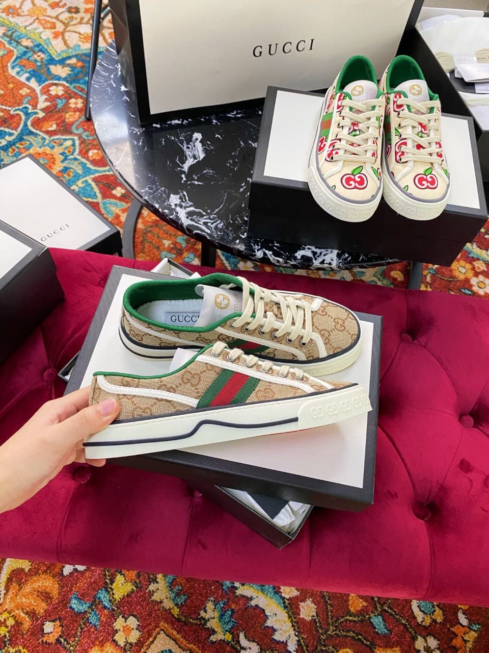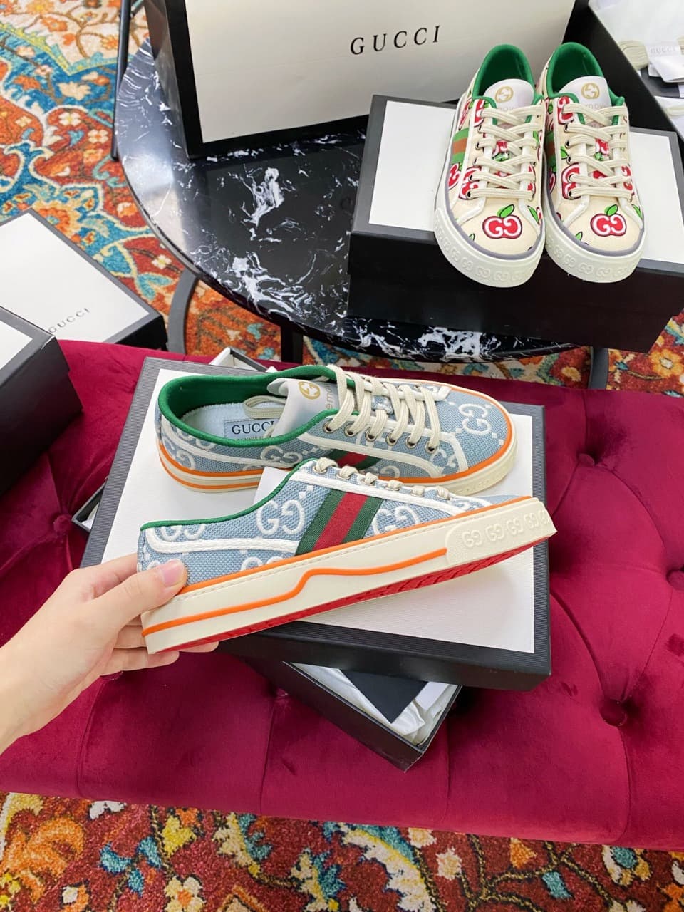 Apesar da construção simples, sem muitos detalhes, o modelo é oferecido em uma variedade de cores e estampas. As mais triviais como as brancas, turquesa e preto agradam quem gosta de um visual mais neutro, sem chamar muito a atenção. Mas há quem goste de estampas com o monograma GG, maçãs e outros.