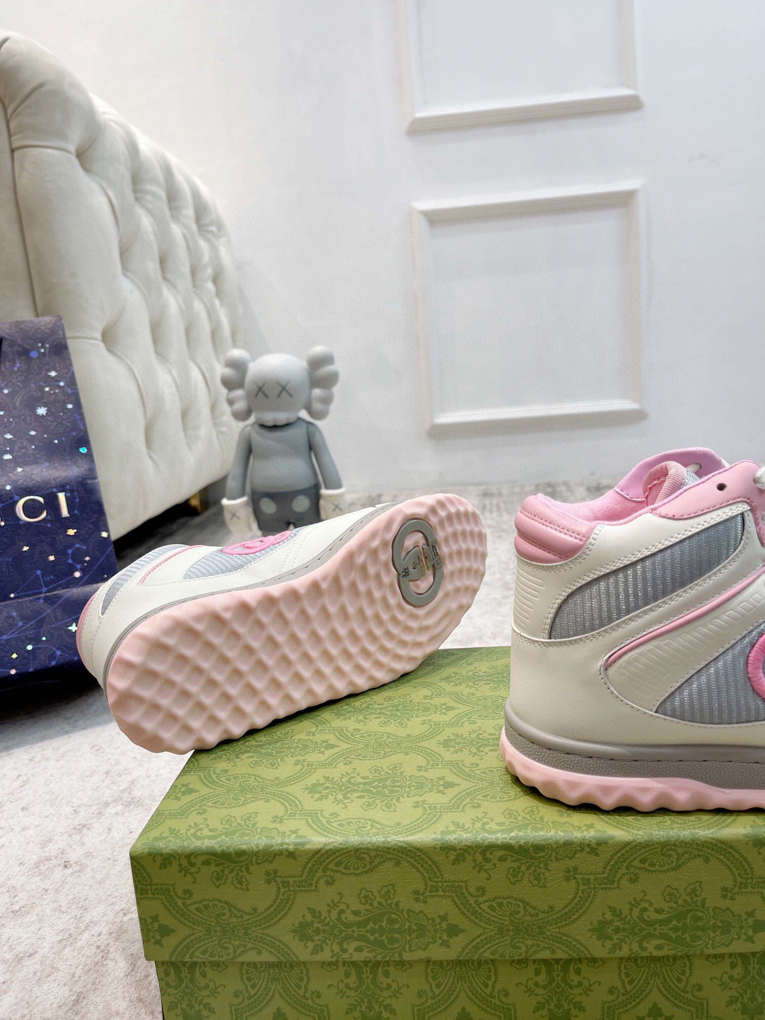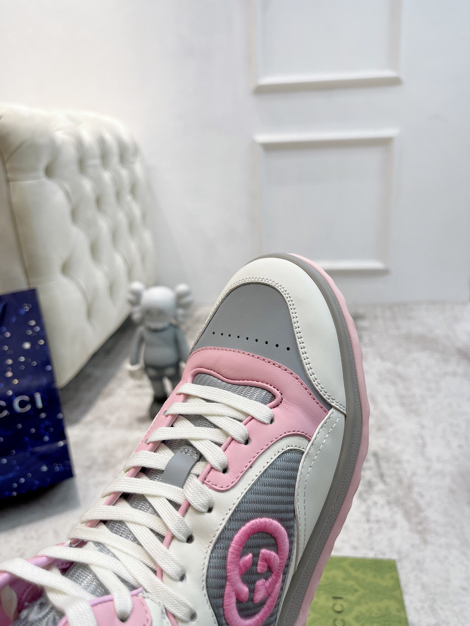 Design: Silhueta clássica com linhas clean e detalhes marcantes, como o logo da Gucci em relevo na lateral e o calcanhar reforçado.
