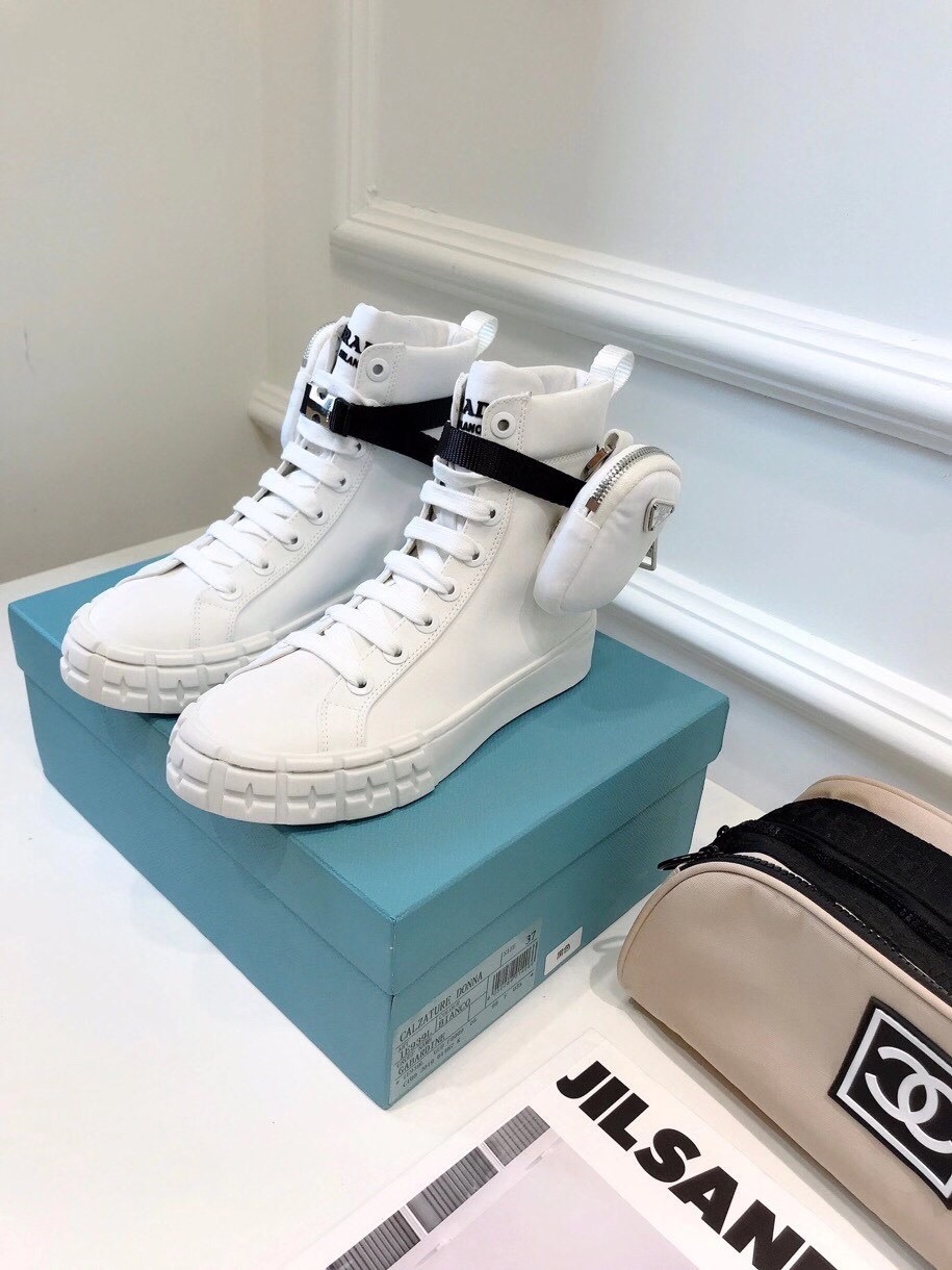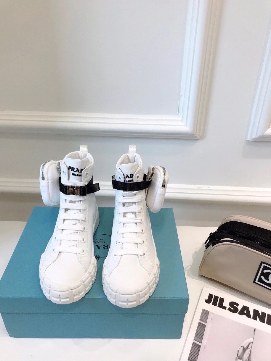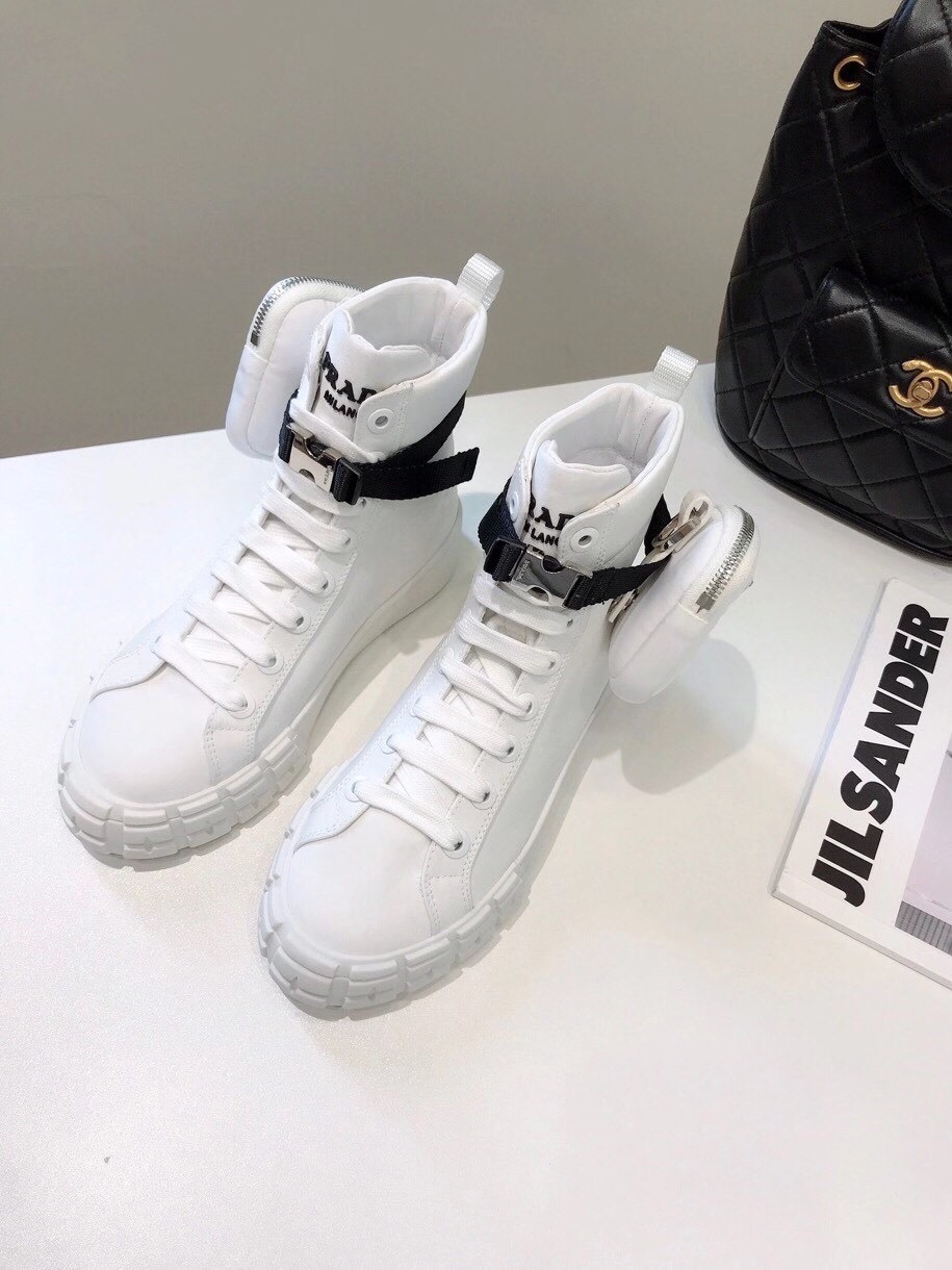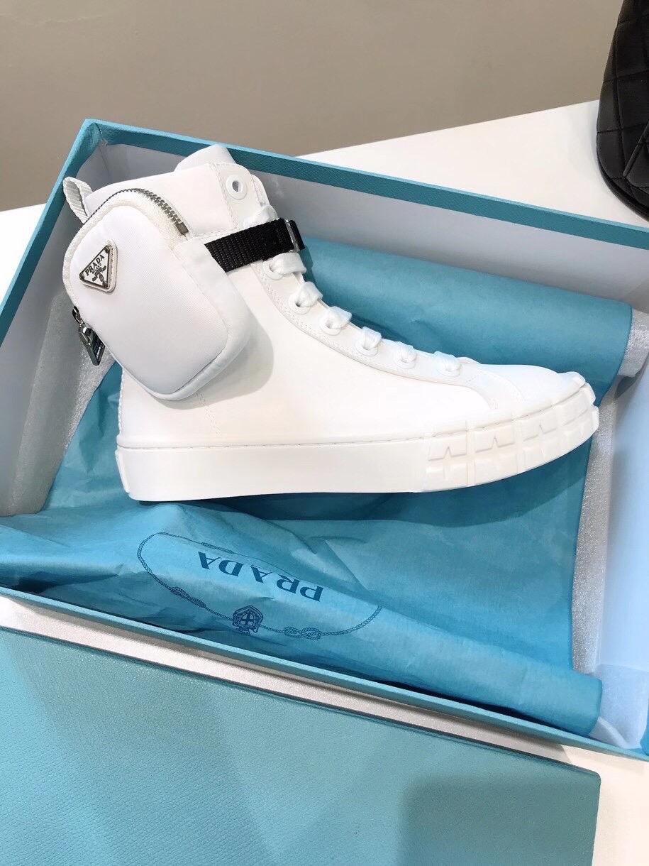 - Definido por uma atitude contemporânea, o novo tênis de cano alto da Prada é inspirado pelo design esportivo dos anos 70. Confeccionado com tecido Re-Nylon, ele é valorizado por detalhes na sola que lembram os sulcos dos pneus de motocross. Uma mini nécessaire removível é presa ao calçado.