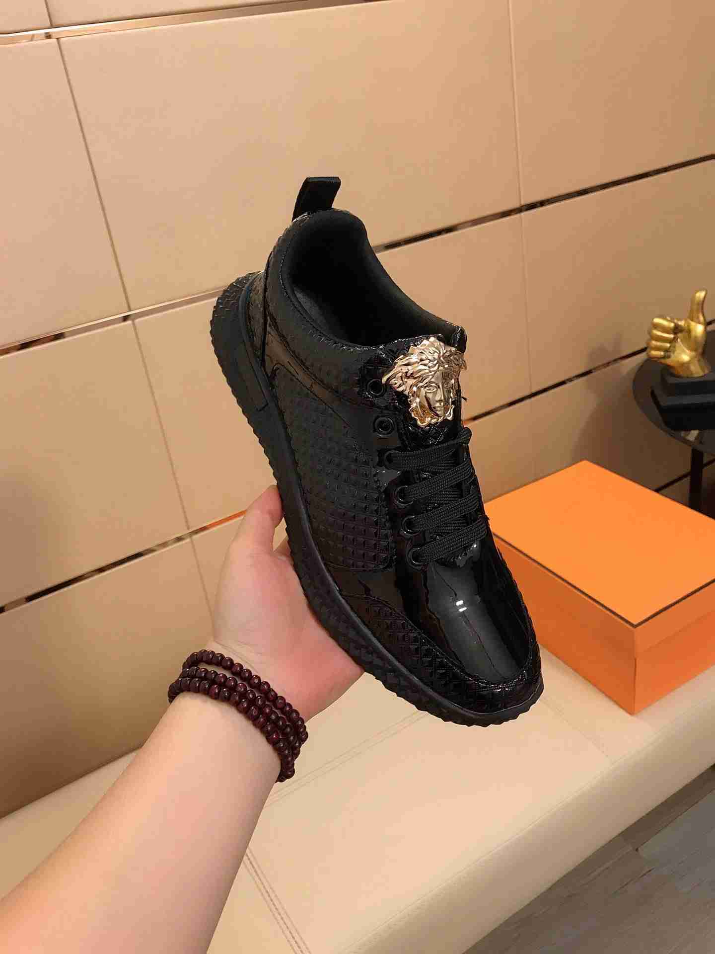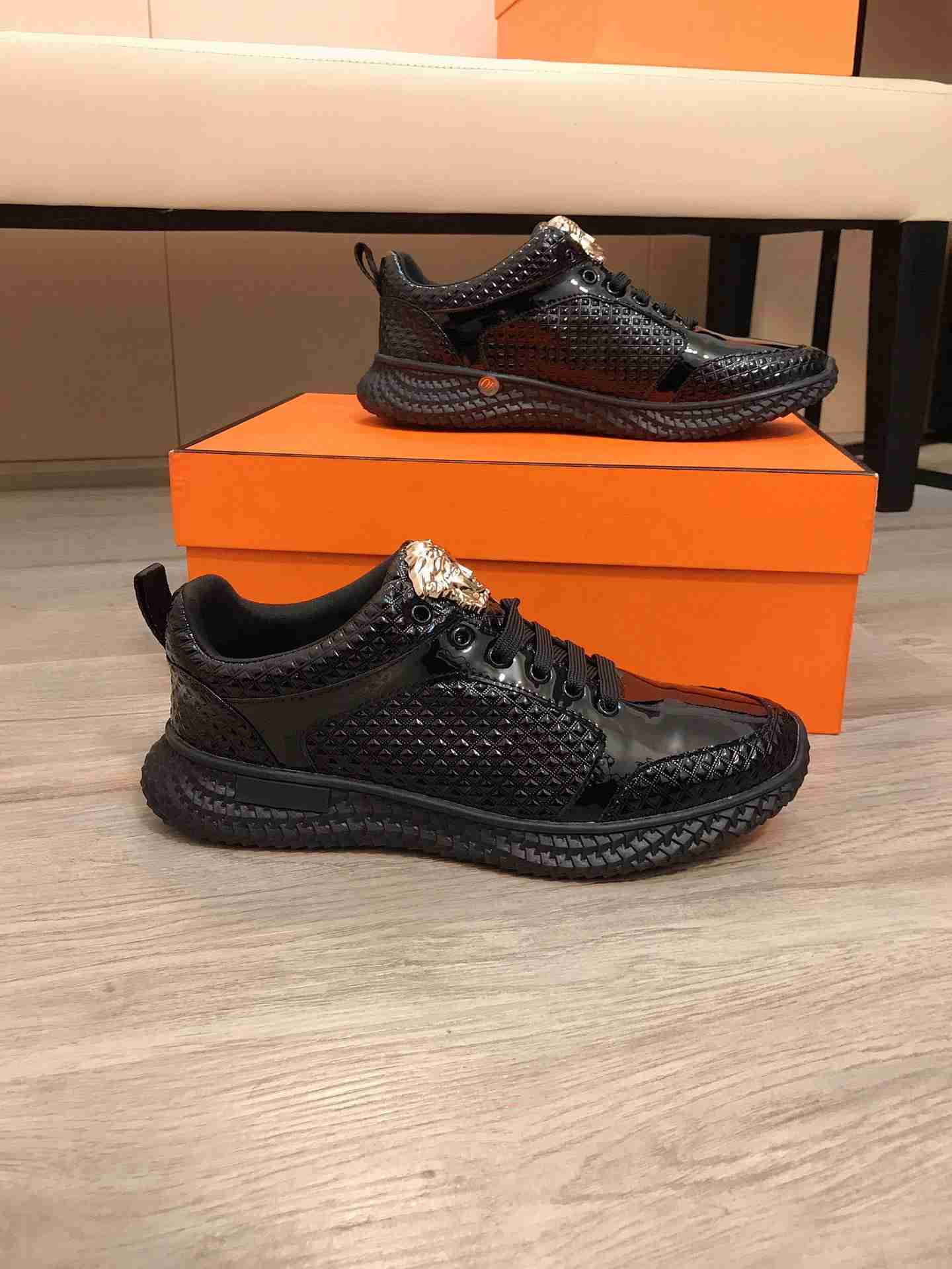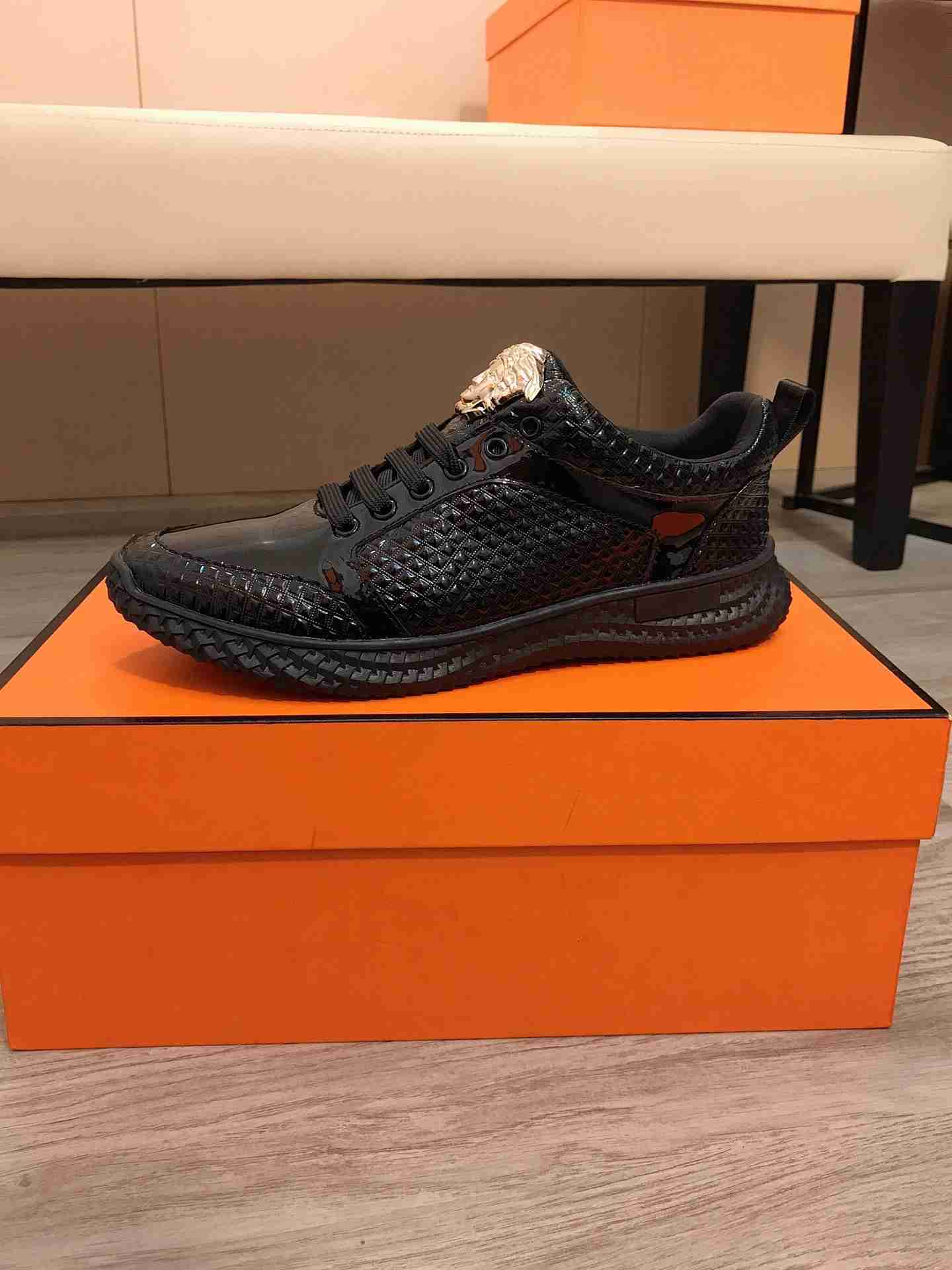 Os homens adoram os tênis da marca Versace por serem sapatos com estilo único, ele possui o seu brasão dourado acima do cadarço, atraindo os olhares para os pés de quem está usando.