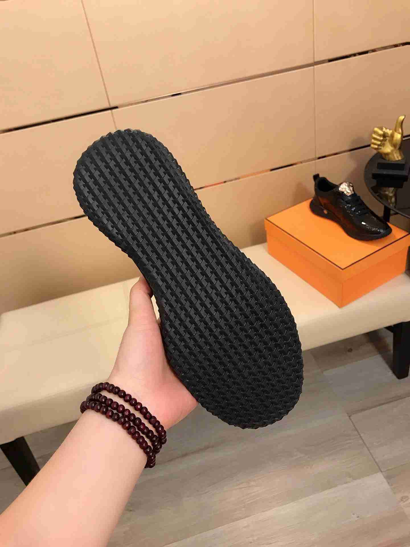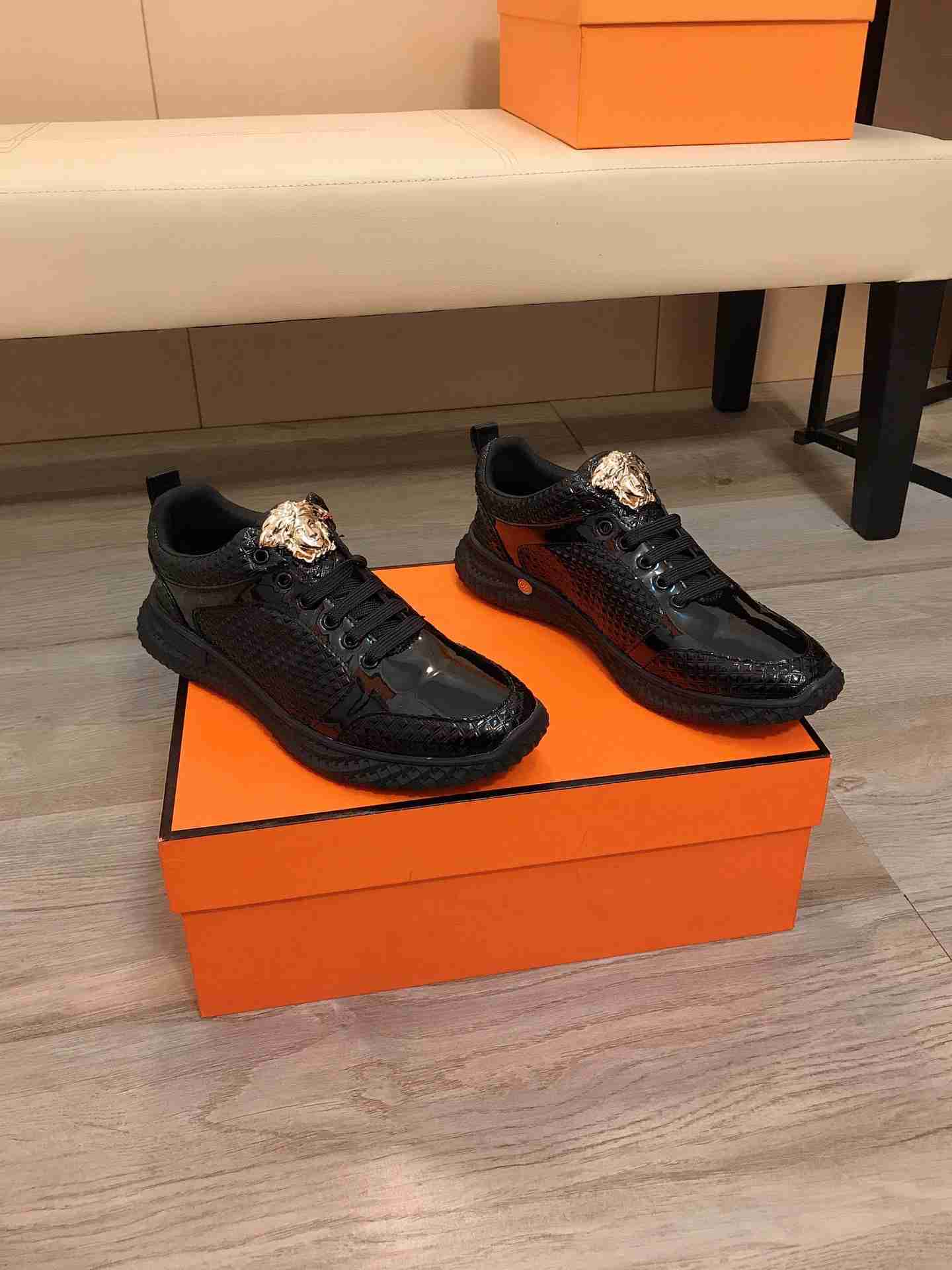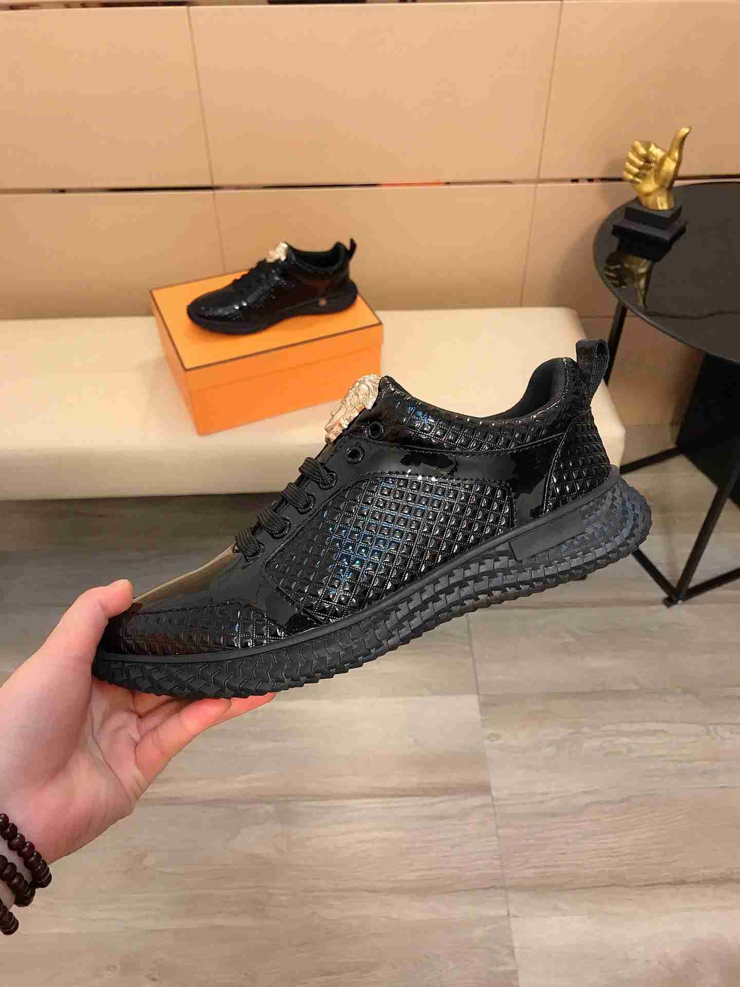 Os homens adoram os tênis da marca Versace por serem sapatos com estilo único, ele possui o seu brasão dourado acima do cadarço, atraindo os olhares para os pés de quem está usando.
