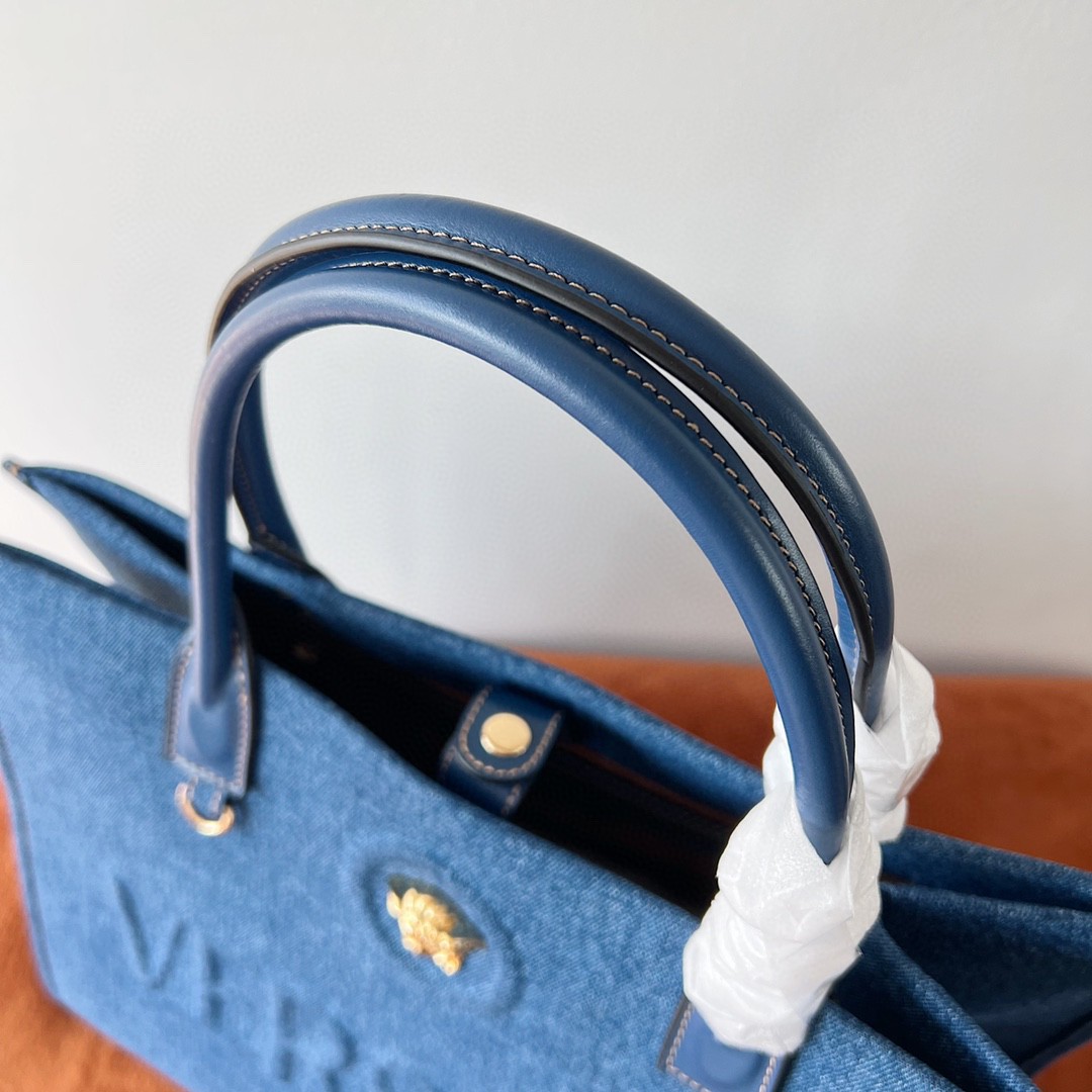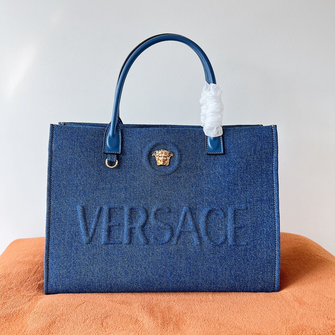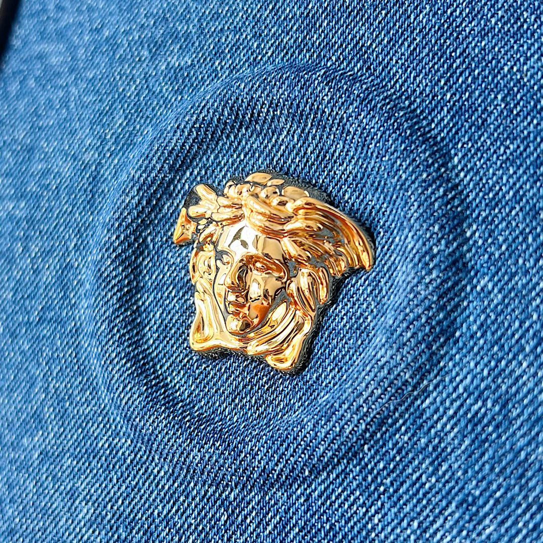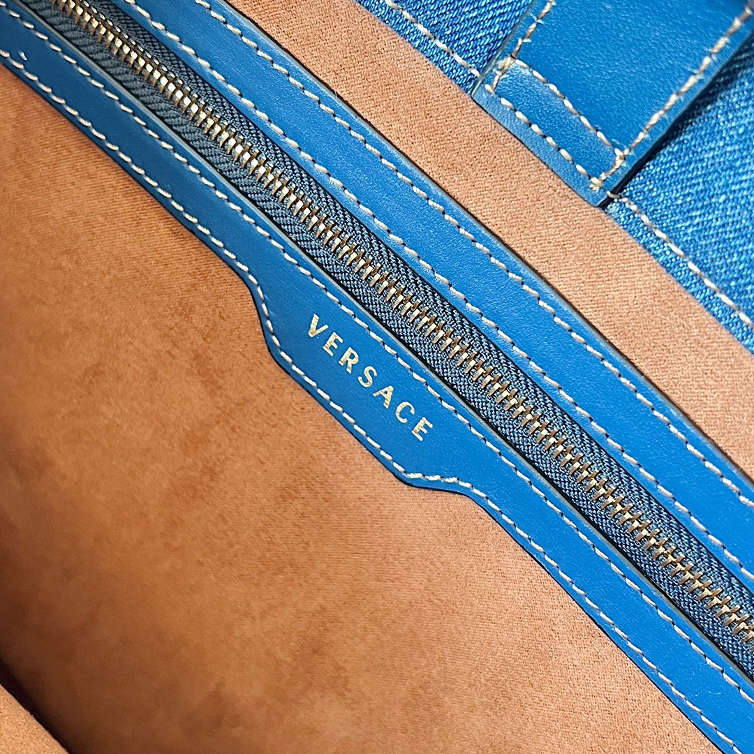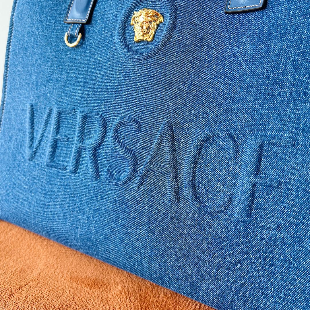 Eleve seu estilo com a Versace Bolsa Tote Jeans Medusa. Esta bolsa tote de denim apresenta o icônico logotipo Medusa da Versace em um design moderno e elegante. Ideal para quem busca um acessório fashion e sofisticado, que combina a robustez do jeans com o luxo característico da Versace.